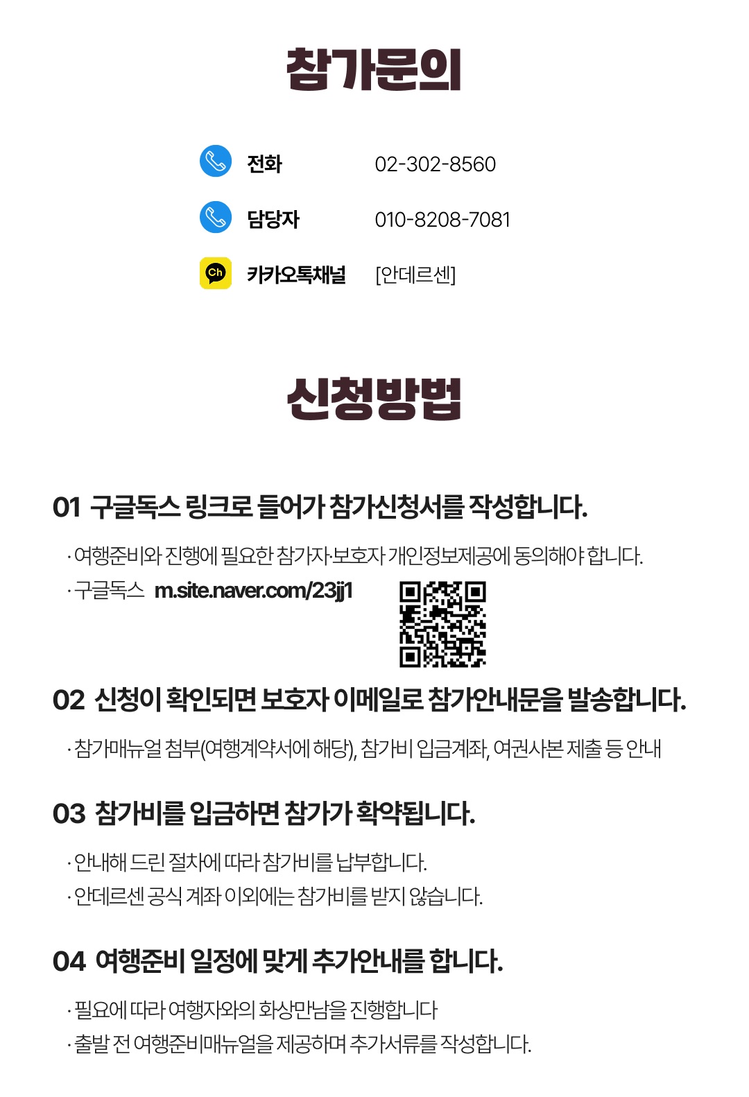 상세한 여행준비를 위해 구글 참가신청서를 작성해주셔야 합니다. 구글독스 참가신청서를 작성하지 않으면 정상적으로 예약이 접수되지 않습니다. 클릭하면 바로 구글 참가신청서로 연결됩니다.