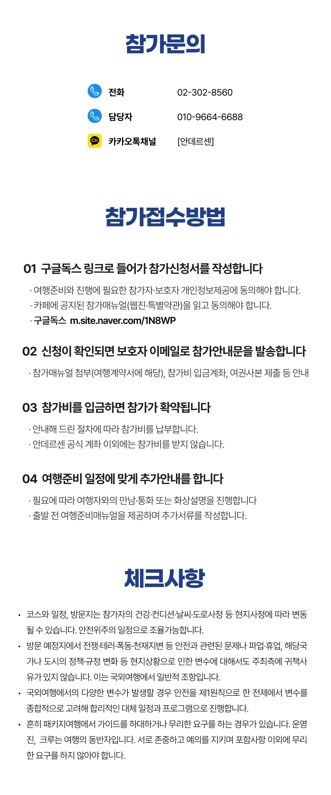 상세한 여행준비를 위해 구글 참가신청서를 작성해주셔야 합니다. 구글독스 참가신청서를 작성하지 않으면 정상적으로 예약이 접수되지 않습니다. 클릭하면 바로 구글 참가신청서로 연결됩니다.
