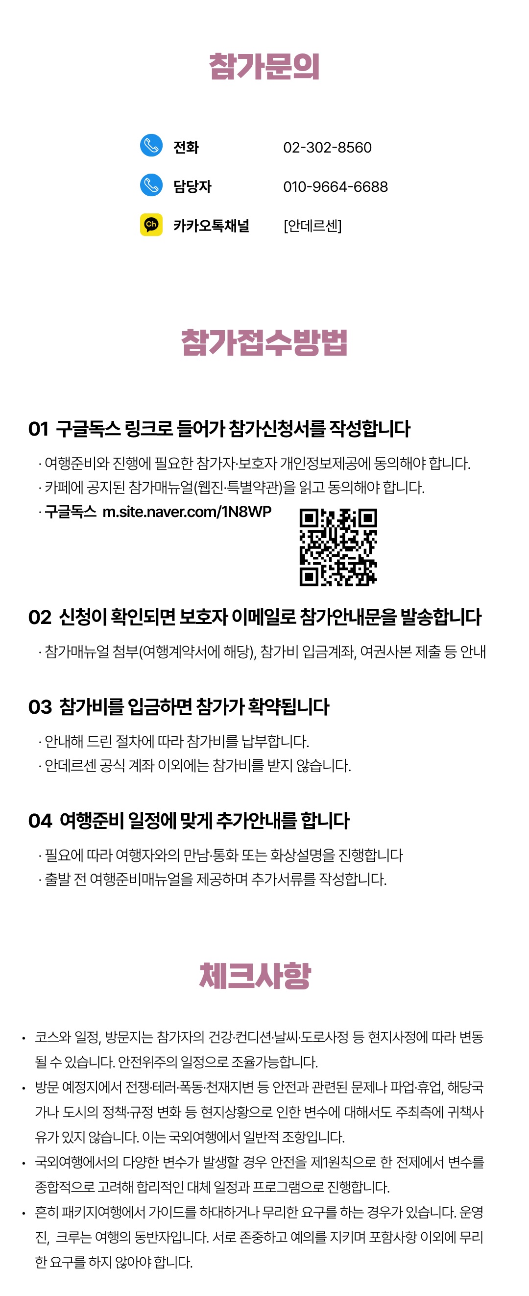 상세한 여행준비를 위해 구글 참가신청서를 작성해주셔야 합니다. 구글독스 참가신청서를 작성하지 않으면 정상적으로 예약이 접수되지 않습니다. 클릭하면 바로 구글 참가신청서로 연결됩니다.
