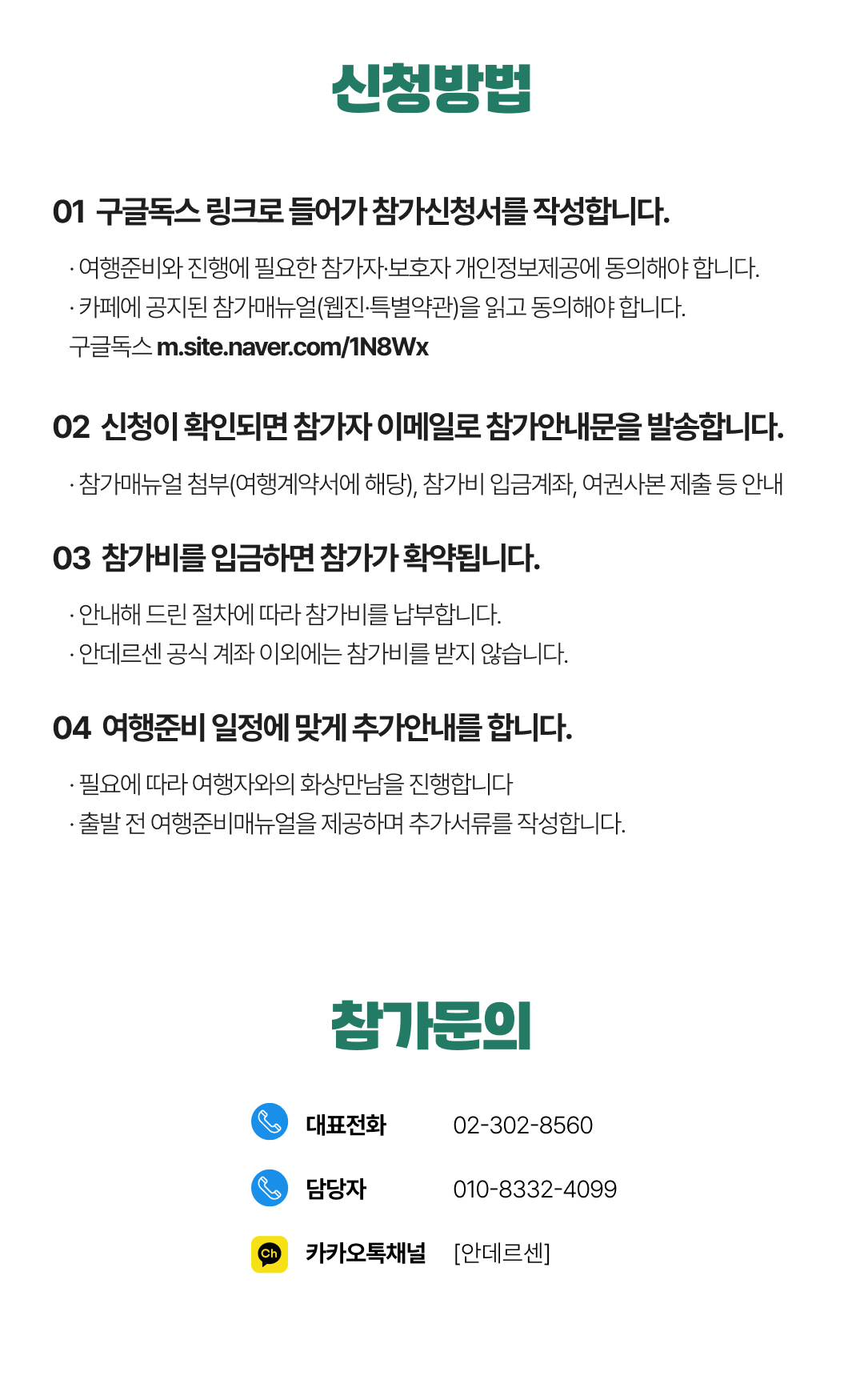 상세한 여행준비를 위해 구글 참가신청서를 작성해주셔야 합니다. 구글독스 참가신청서를 작성하지 않으면 정상적으로 예약이 접수되지 않습니다. 클릭하면 바로 구글 참가신청서로 연결됩니다.