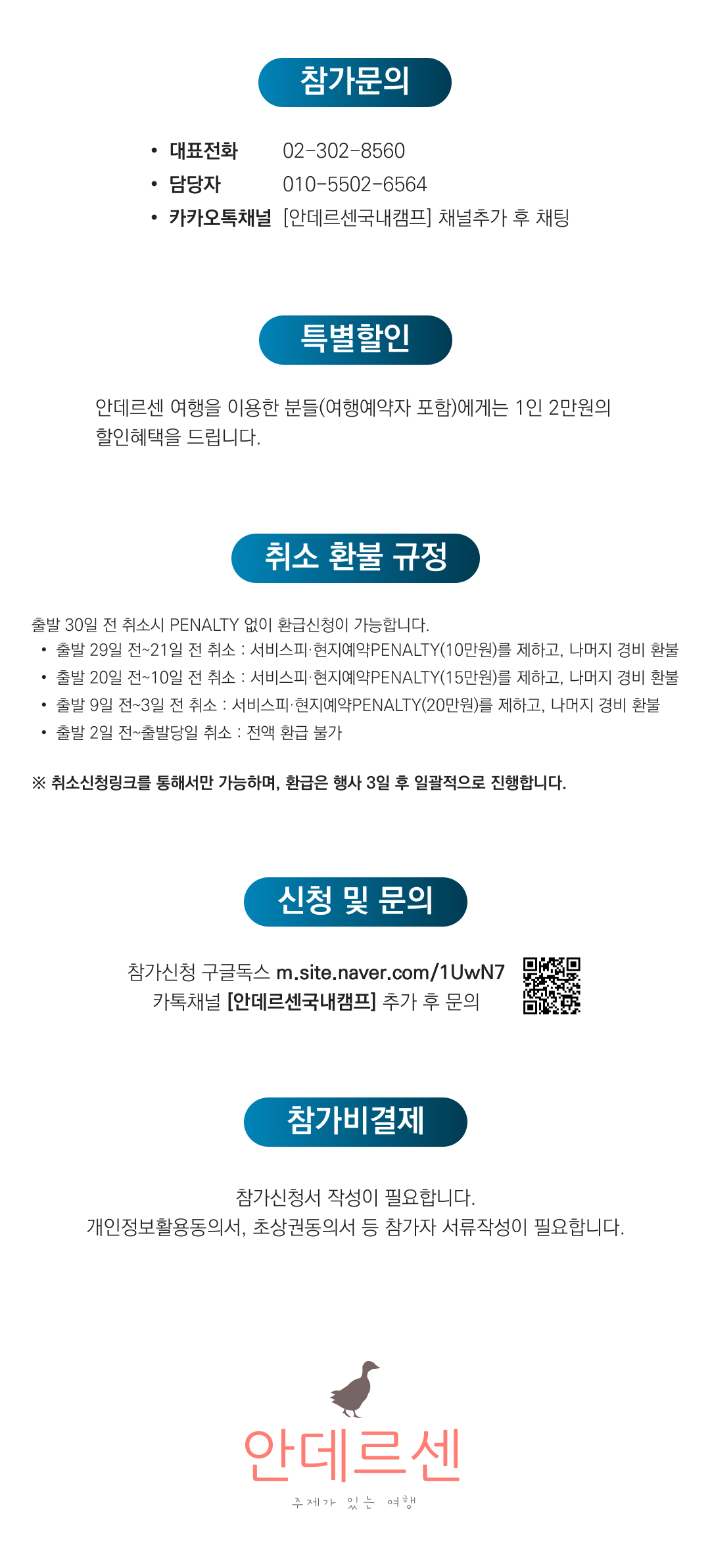 상세한 여행준비를 위해 구글 참가신청서를 작성해주셔야 합니다. 구글독스 참가신청서를 작성하지 않으면 정상적으로 예약이 접수되지 않습니다. 클릭하면 바로 구글 참가신청서로 연결됩니다.