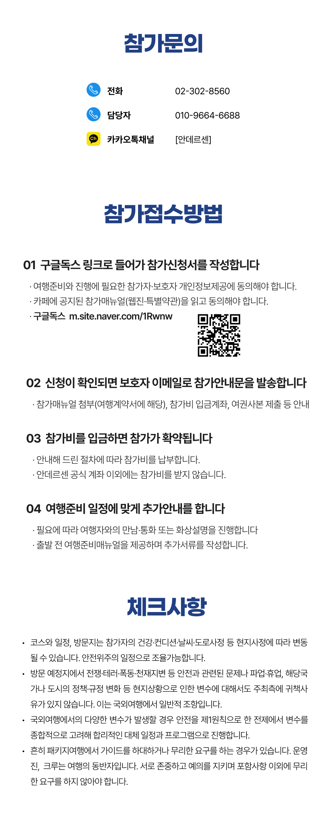상세한 여행준비를 위해 구글 참가신청서를 작성해주셔야 합니다. 구글독스 참가신청서를 작성하지 않으면 정상적으로 예약이 접수되지 않습니다. 클릭하면 바로 구글 참가신청서로 연결됩니다.