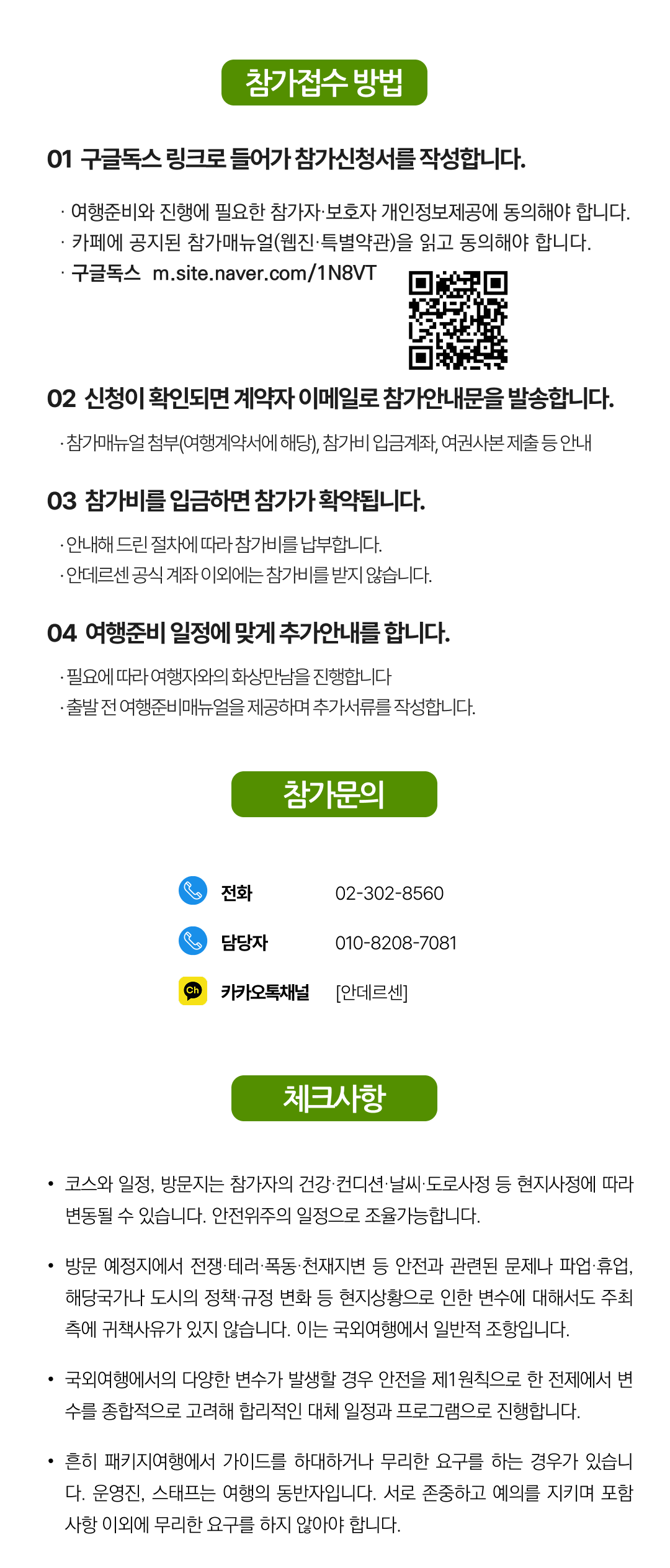 상세한 여행준비를 위해 구글 참가신청서를 작성해주셔야 합니다. 구글독스 참가신청서를 작성하지 않으면 정상적으로 예약이 접수되지 않습니다. 클릭하면 바로 구글 참가신청서로 연결됩니다.