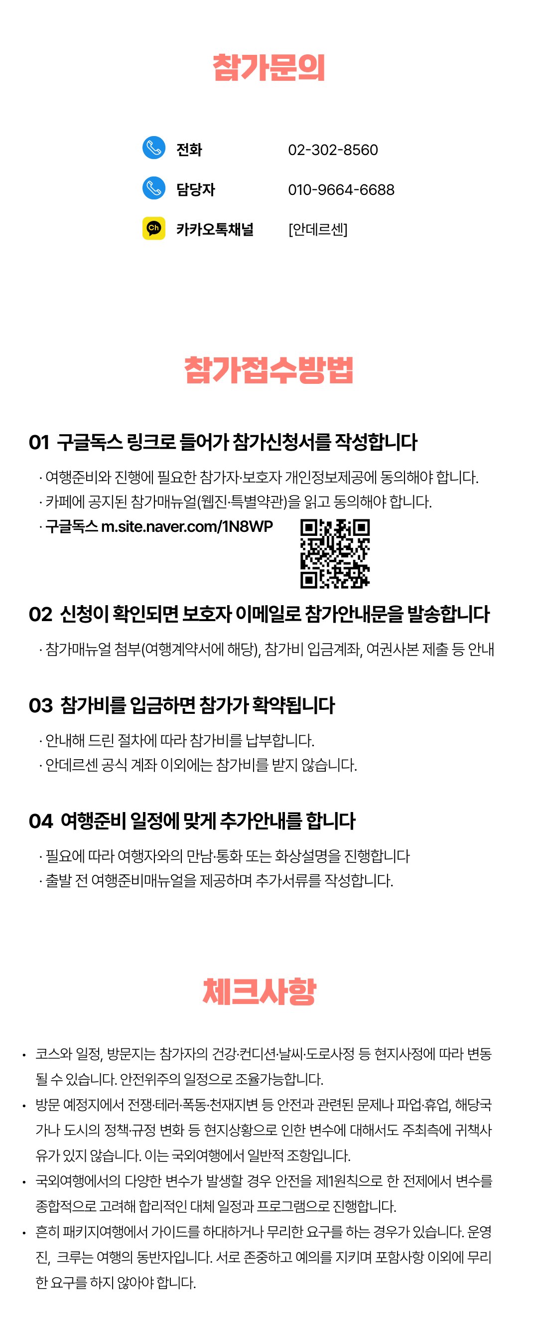 상세한 여행준비를 위해 구글 참가신청서를 작성해주셔야 합니다. 구글독스 참가신청서를 작성하지 않으면 정상적으로 예약이 접수되지 않습니다. 클릭하면 바로 구글 참가신청서로 연결됩니다.
