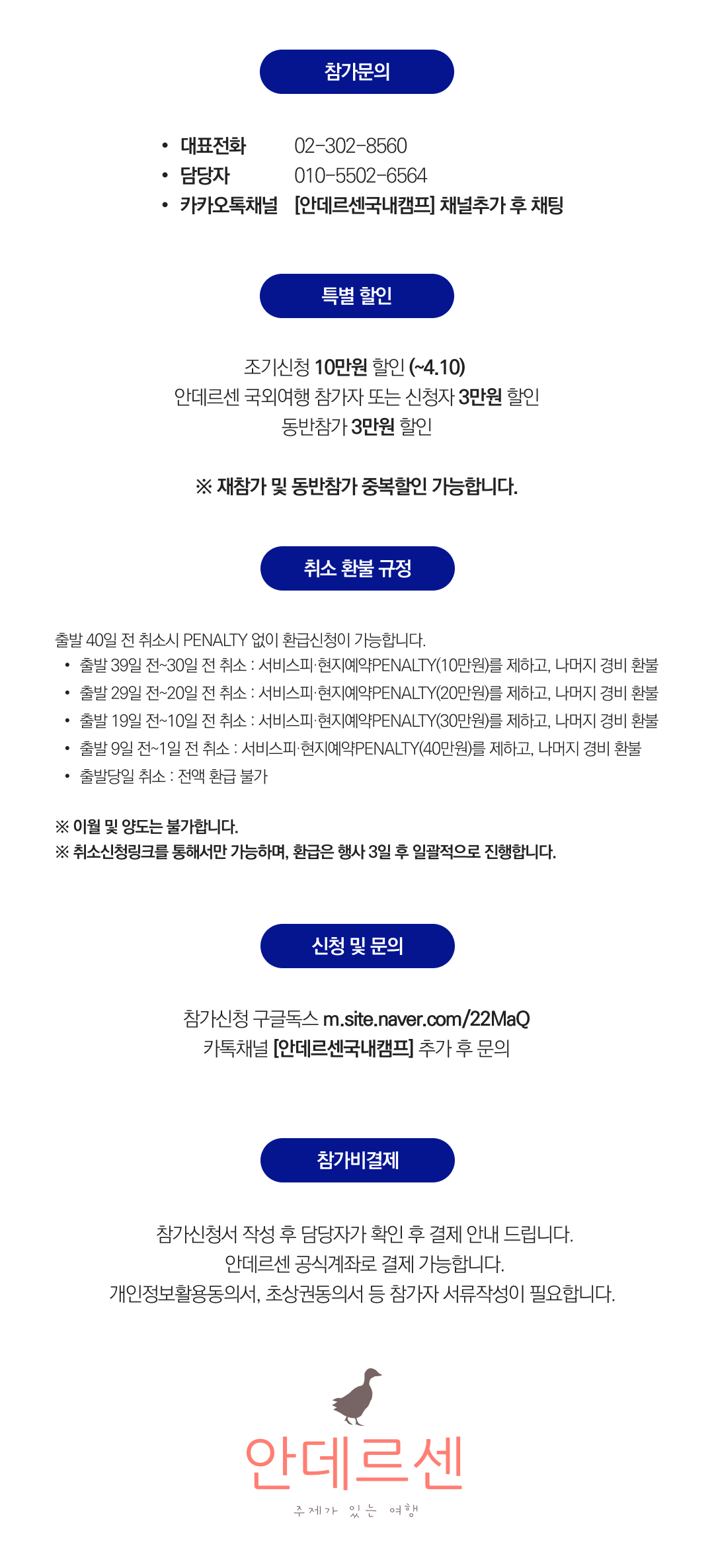 상세한 여행준비를 위해 구글 참가신청서를 작성해주셔야 합니다. 구글독스 참가신청서를 작성하지 않으면 정상적으로 예약이 접수되지 않습니다. 클릭하면 바로 구글 참가신청서로 연결됩니다.