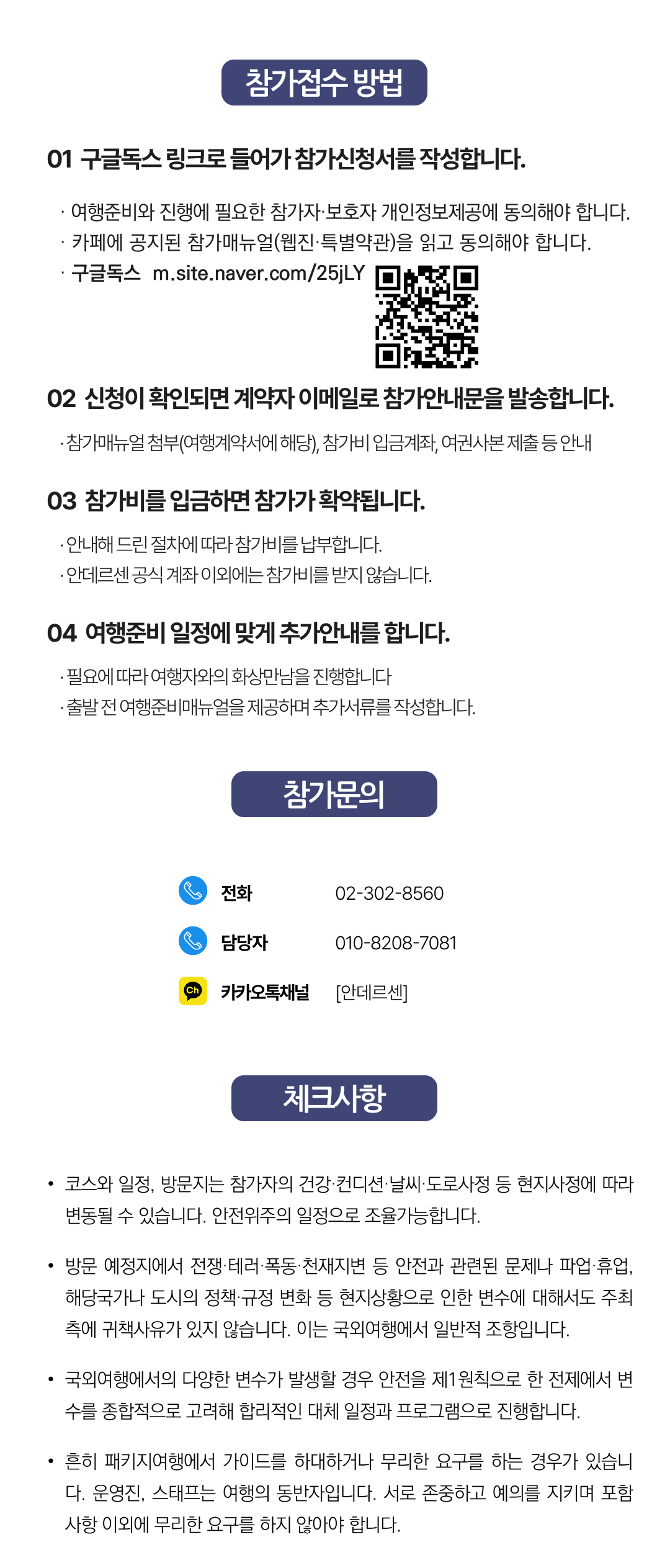 상세한 여행준비를 위해 구글 참가신청서를 작성해주셔야 합니다. 구글독스 참가신청서를 작성하지 않으면 정상적으로 예약이 접수되지 않습니다. 클릭하면 바로 구글 참가신청서로 연결됩니다.