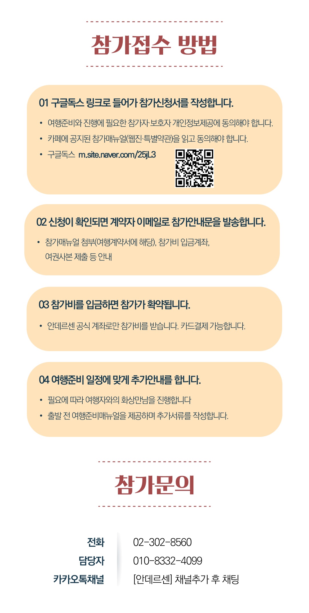 상세한 여행준비를 위해 구글 참가신청서를 작성해주셔야 합니다. 구글독스 참가신청서를 작성하지 않으면 정상적으로 예약이 접수되지 않습니다. 클릭하면 바로 구글 참가신청서로 연결됩니다.