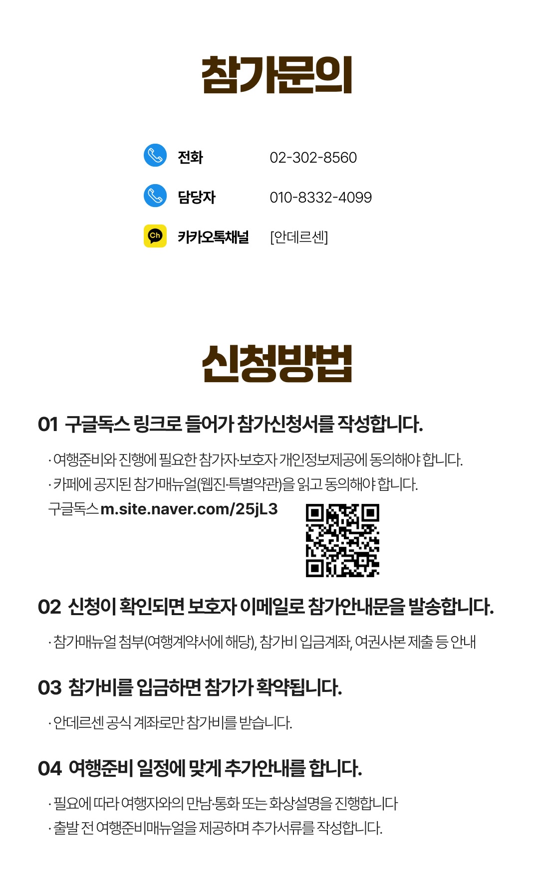 상세한 여행준비를 위해 구글 참가신청서를 작성해주셔야 합니다. 구글독스 참가신청서를 작성하지 않으면 정상적으로 예약이 접수되지 않습니다. 클릭하면 바로 구글 참가신청서로 연결됩니다.