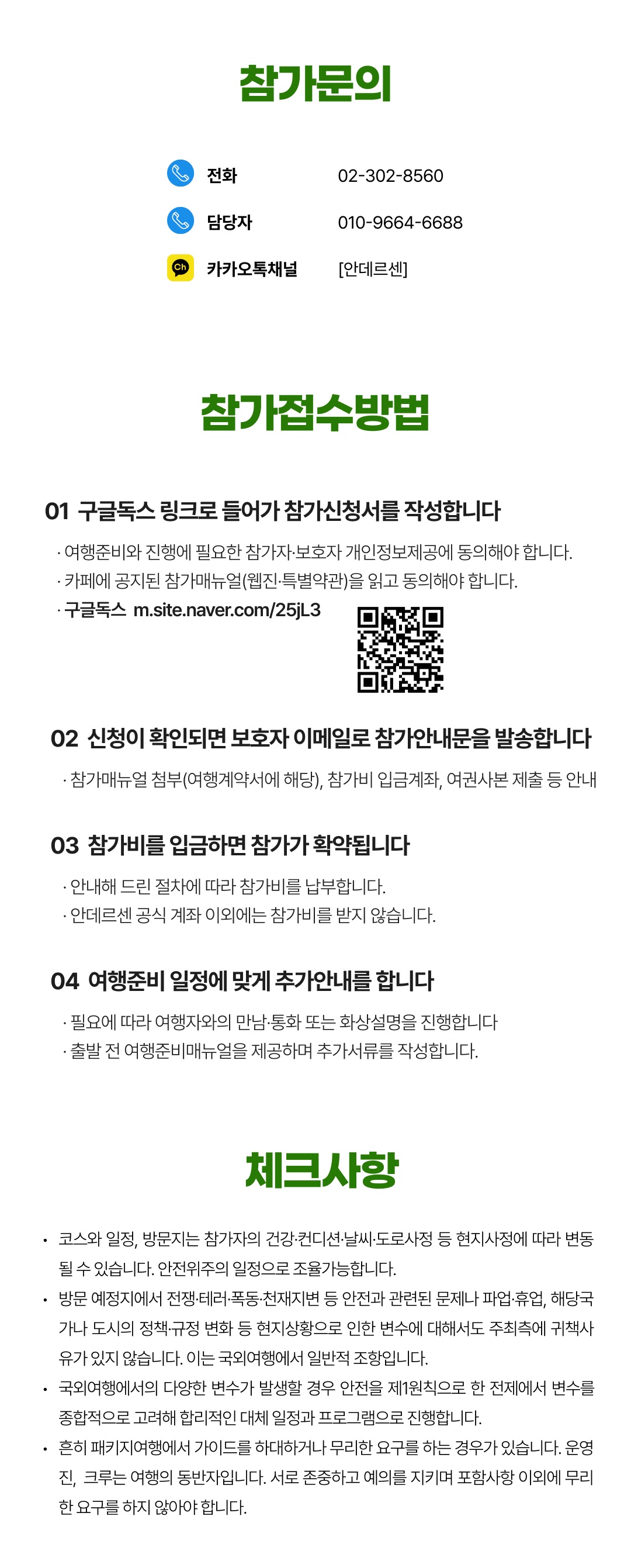 상세한 여행준비를 위해 구글 참가신청서를 작성해주셔야 합니다. 구글독스 참가신청서를 작성하지 않으면 정상적으로 예약이 접수되지 않습니다. 클릭하면 바로 구글 참가신청서로 연결됩니다.