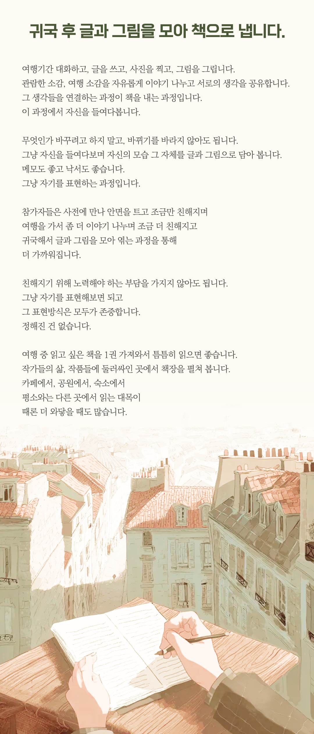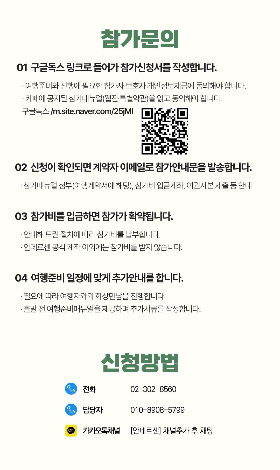 상세한 여행준비를 위해 구글 참가신청서를 작성해주셔야 합니다. 구글독스 참가신청서를 작성하지 않으면 정상적으로 예약이 접수되지 않습니다. 클릭하면 바로 구글 참가신청서로 연결됩니다.