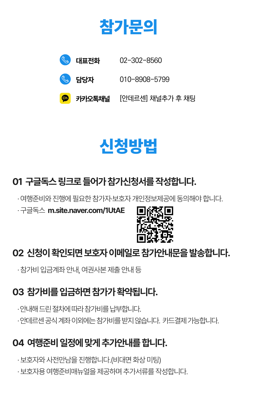 상세한 여행준비를 위해 구글 참가신청서를 작성해주셔야 합니다. 구글독스 참가신청서를 작성하지 않으면 정상적으로 예약이 접수되지 않습니다. 클릭하면 바로 구글 참가신청서로 연결됩니다.