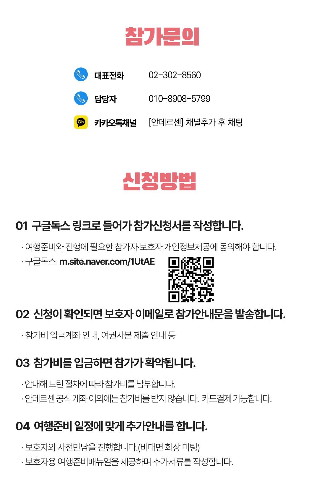 상세한 여행준비를 위해 구글 참가신청서를 작성해주셔야 합니다. 구글독스 참가신청서를 작성하지 않으면 정상적으로 예약이 접수되지 않습니다. 클릭하면 바로 구글 참가신청서로 연결됩니다.