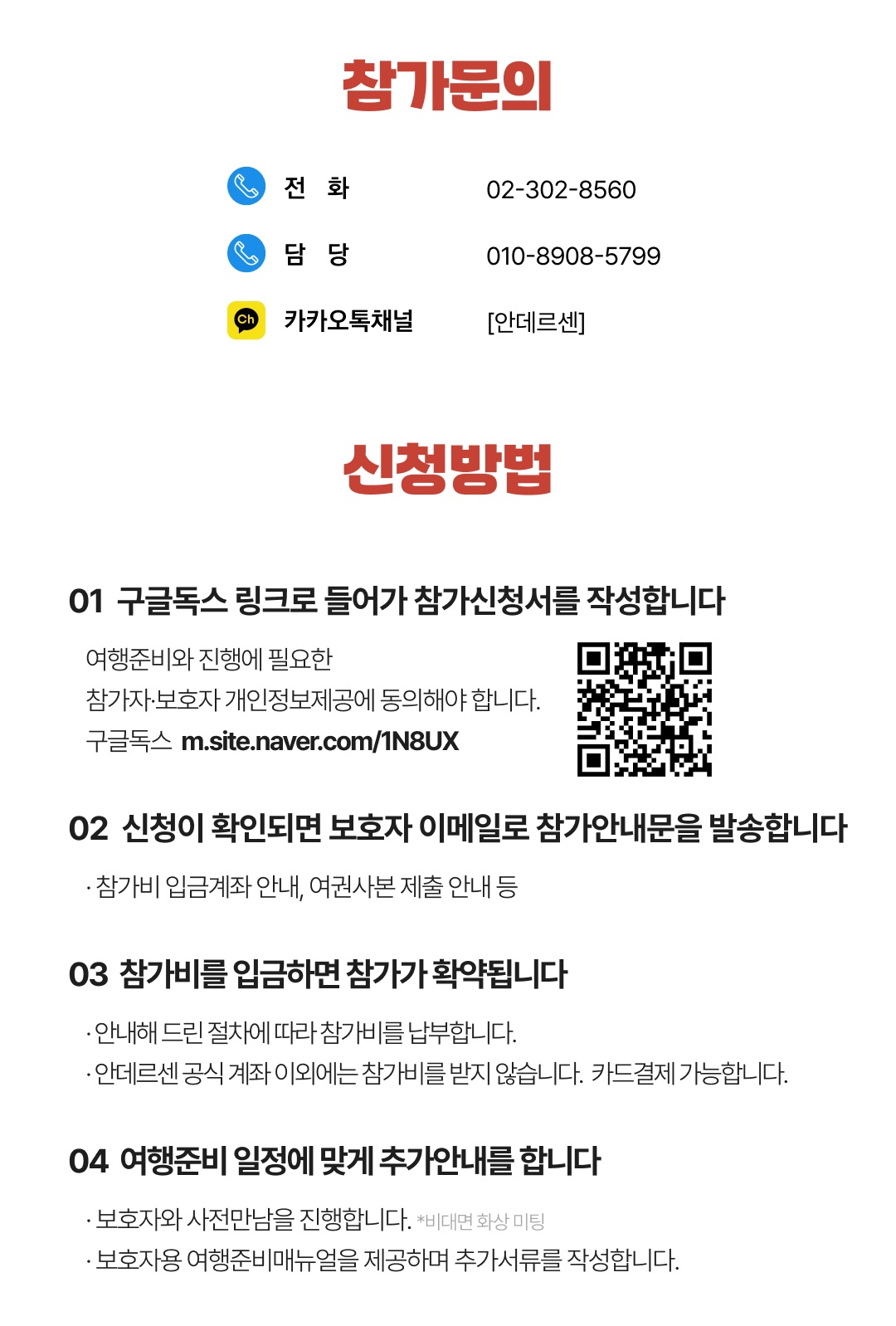 상세한 여행준비를 위해 구글 참가신청서를 작성해주셔야 합니다. 구글독스 참가신청서를 작성하지 않으면 정상적으로 예약이 접수되지 않습니다. 클릭하면 바로 구글 참가신청서로 연결됩니다.