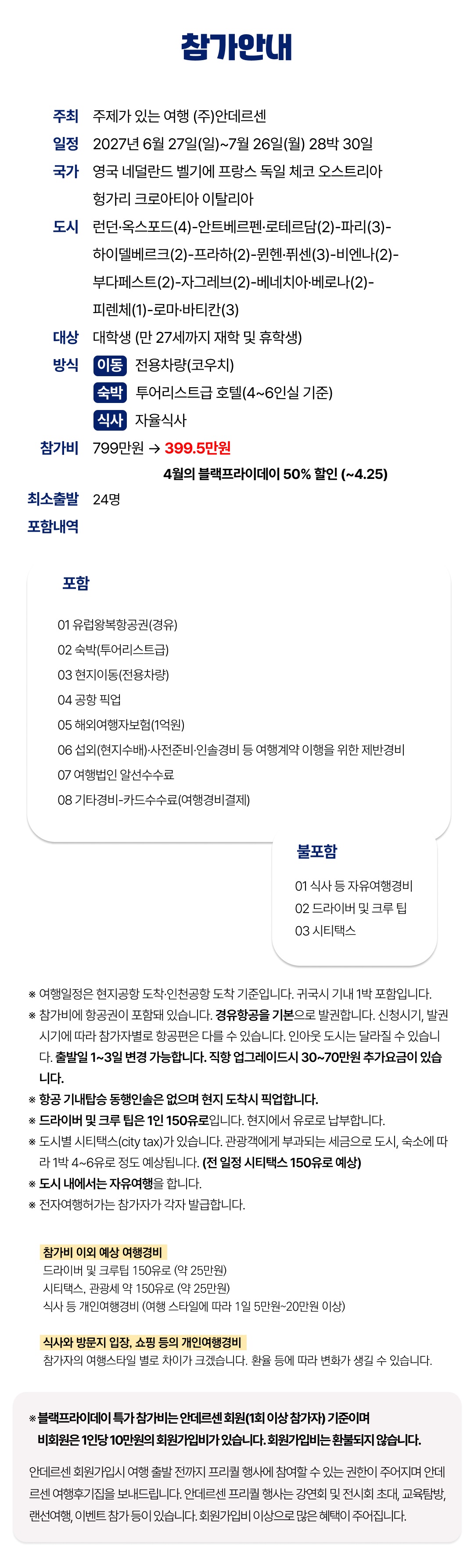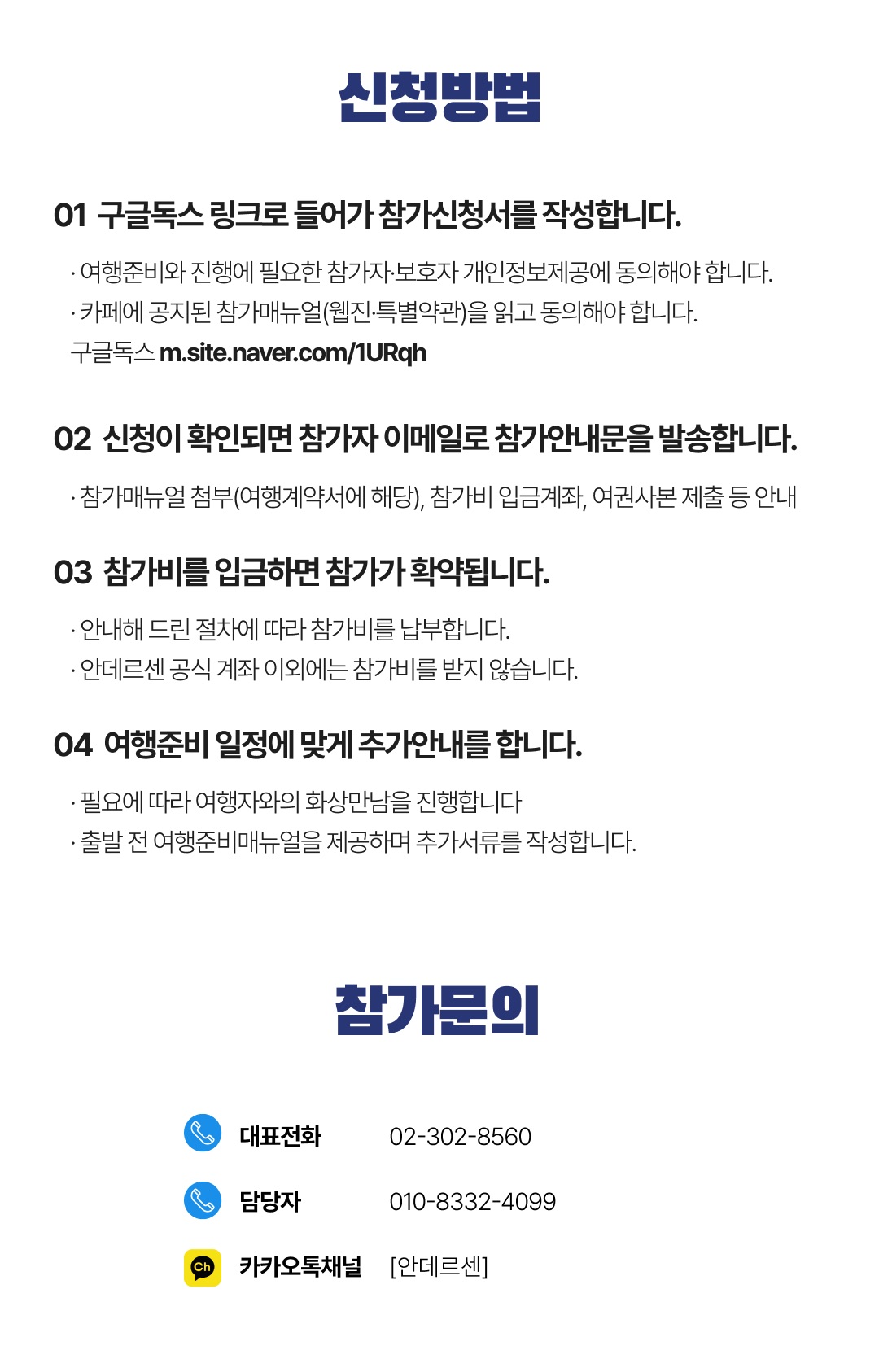 상세한 여행준비를 위해 구글 참가신청서를 작성해주셔야 합니다. 구글독스 참가신청서를 작성하지 않으면 정상적으로 예약이 접수되지 않습니다. 클릭하면 바로 구글 참가신청서로 연결됩니다.