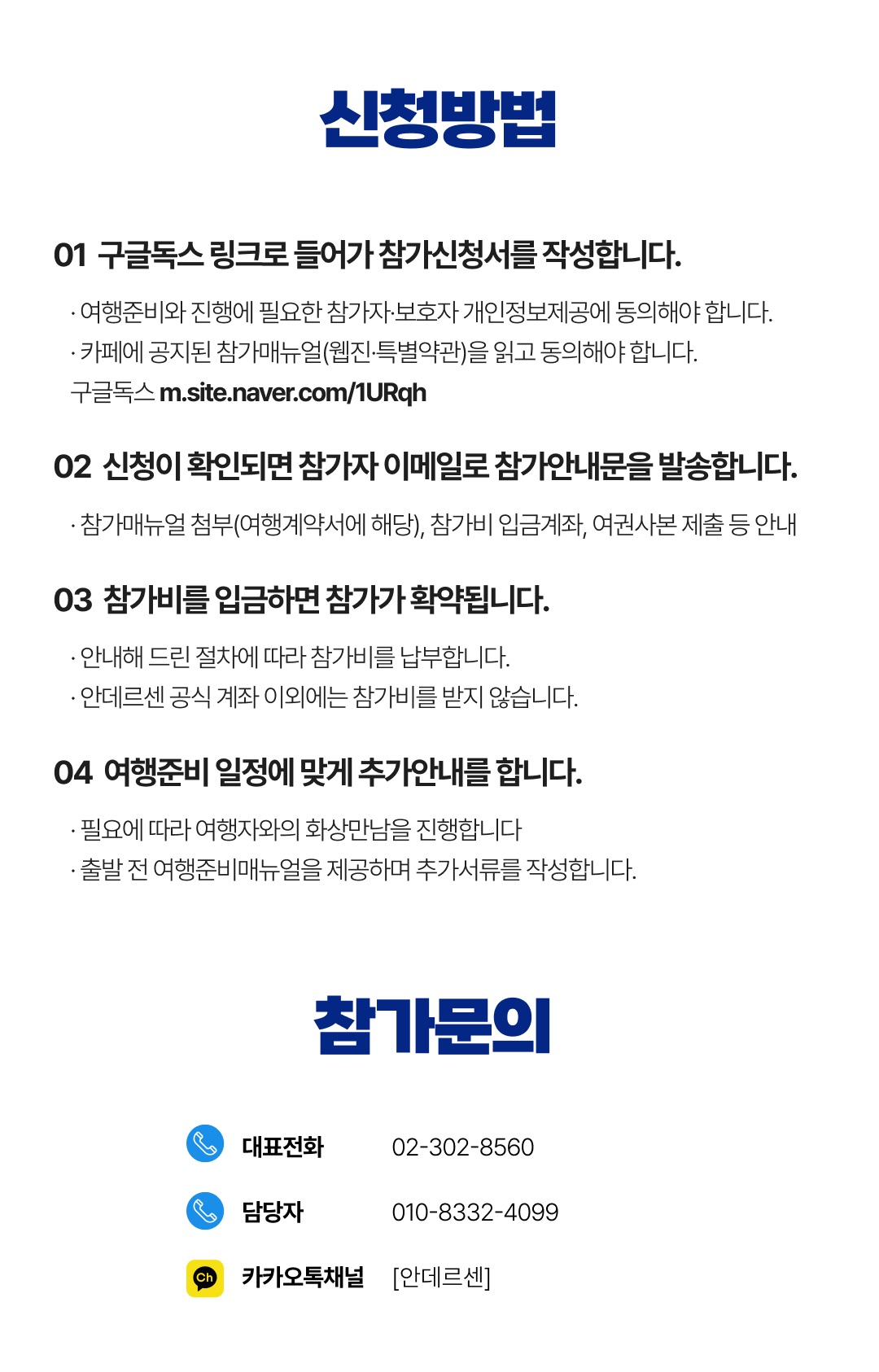 상세한 여행준비를 위해 구글 참가신청서를 작성해주셔야 합니다. 구글독스 참가신청서를 작성하지 않으면 정상적으로 예약이 접수되지 않습니다. 클릭하면 바로 구글 참가신청서로 연결됩니다.