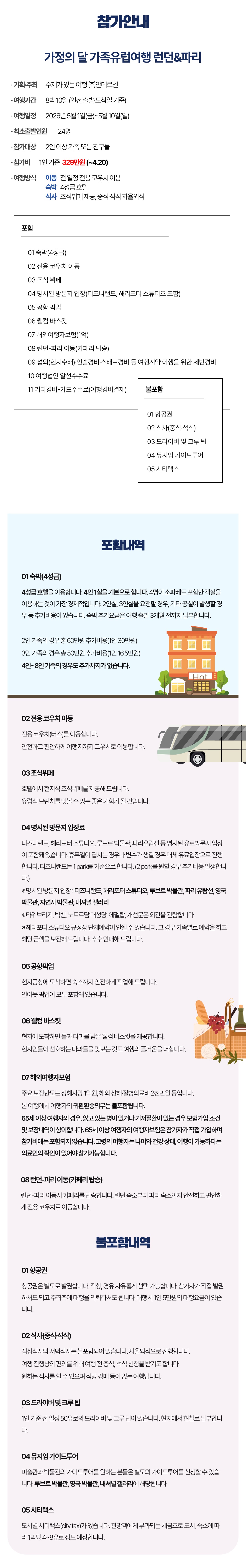 가족과 함께, 친구와 함께 추억을 만드는 여행! 함께 여행하며 서로에 대해 더 잘 알아갑니다. 이런 분들에게 추천합니다 - 아이와 동반해서 여행을 떠나려는 가족들 - 부모님을 모시고 가는 여행을 준비하는 가족들 - 유럽여행을 계획하고 있는 친구들 - 디즈니랜드, 해리포터스튜디오를 버킷리스트로 가지고 있는 분들 - 여행일정 : 2026년 5월 1일(금)~5월 10일(일) 8박 10일 - 참가대상 : 2인 이상 가족 또는 친구들
