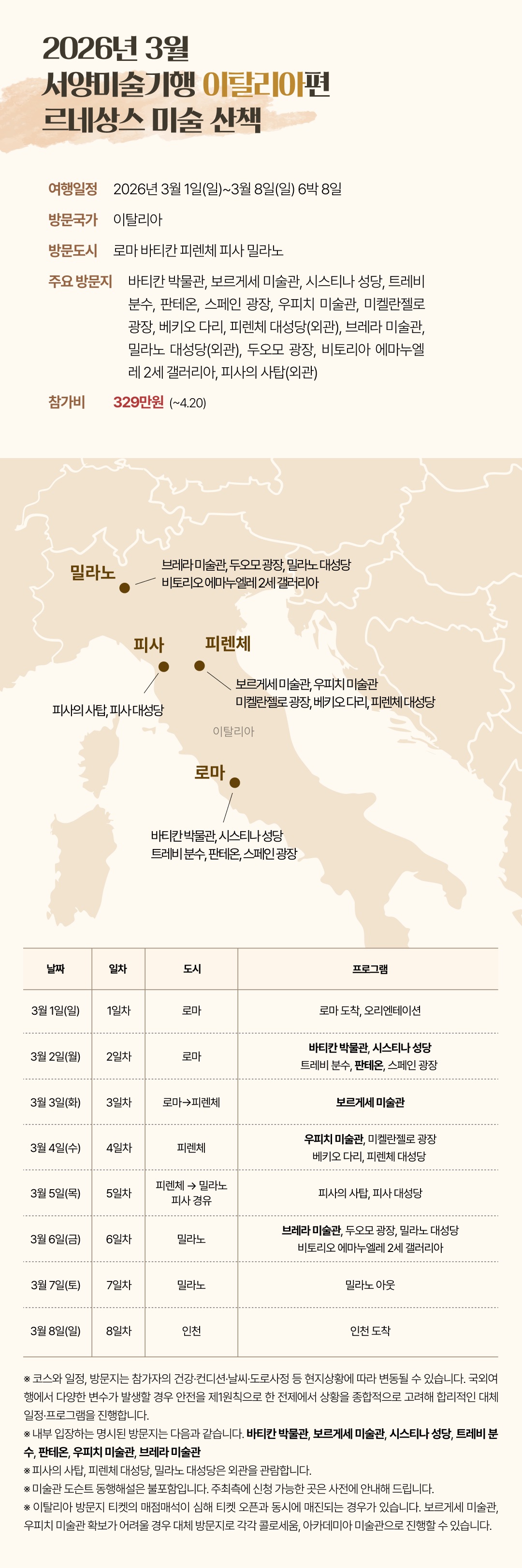 - 주요 방문지 : 바티칸 박물관, 보르게세 미술관, 시스티나 성당, 트레비 분수, 판테온, 스페인 광장, 우피치 미술관, 미켈란젤로 광장, 베키오 다리, 피렌체 대성당(외관), 브레라 미술관, 밀라노 대성당(외관), 두오모 광장, 비토리아 에마누엘레 2세 갤러리아, 피사의 사탑(외관)