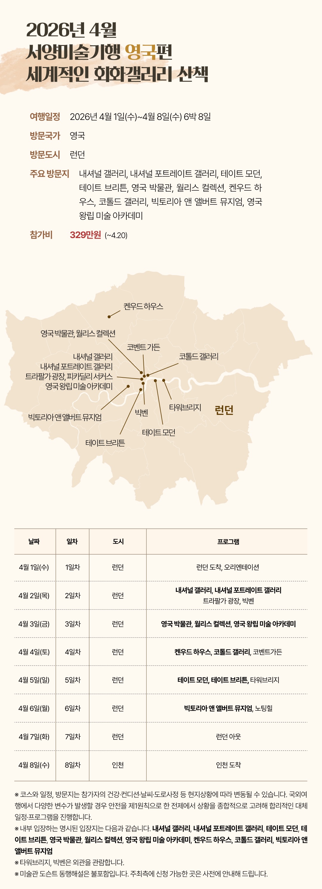 - 주요 방문지 : 내셔널 갤러리, 내셔널 포트레이트 갤러리, 테이트 모던, 테이트 브리튼, 영국 박물관, 월리스 컬렉션, 켄우드 하우스, 코틀드 갤러리, 빅토리아 앤 앨버트 뮤지엄, 영국 왕립 미술 아카데미