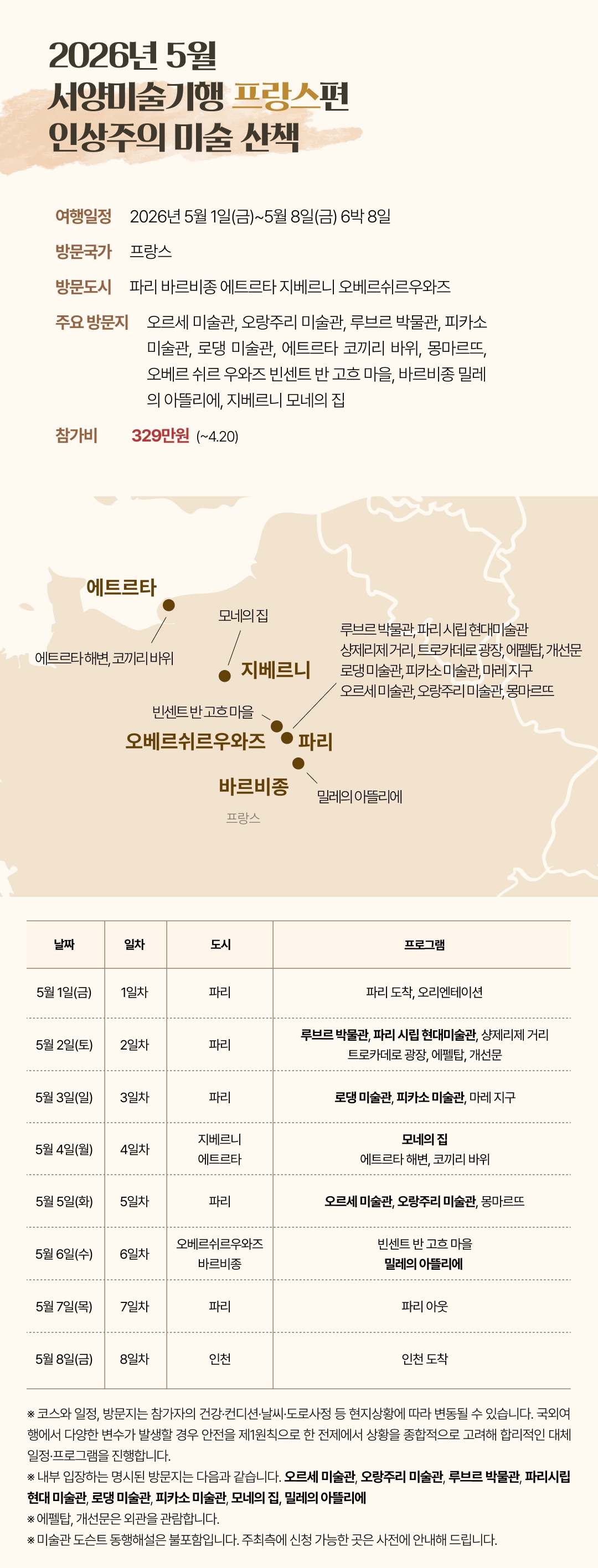 - 주요 방문지 : 오르세 미술관, 오랑주리 미술관, 루브르 박물관, 피카소 미술관, 로댕 미술관, 에트르타 코끼리 바위, 몽마르뜨, 오베르 쉬르 우와즈 빈센트 반 고흐 마을, 바르비종 밀레의 아뜰리에, 지베르니 모네의 집