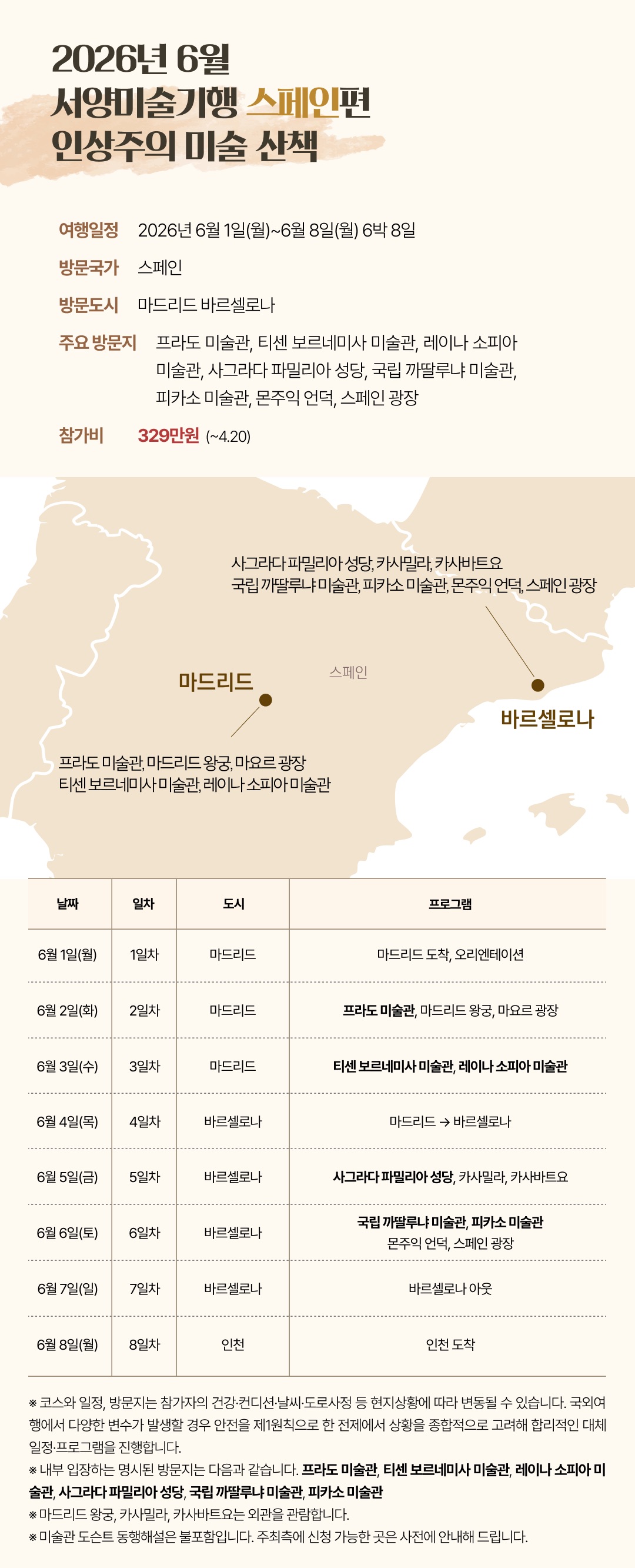 - 주요 방문지 : 프라도 미술관, 티센 보르네미사 미술관, 레이나 소피아 미술관, 사그라다 파밀리아 성당, 국립 까딸루냐 미술관, 피카소 미술관, 몬주익 언덕, 스페인 광장