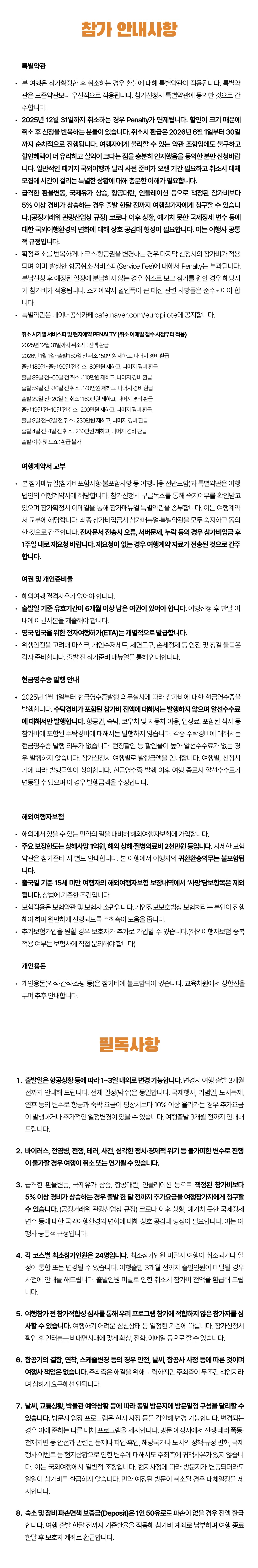 항공은 경유항공을 기준으로 합니다. 직항 옵션 선택시 추가비용이 발생합니다. 항공상황, 학사일정 등에 따라 출발일이 1~3일 달라질 수 있습니다. 전체 여행 기간은 동일합니다.