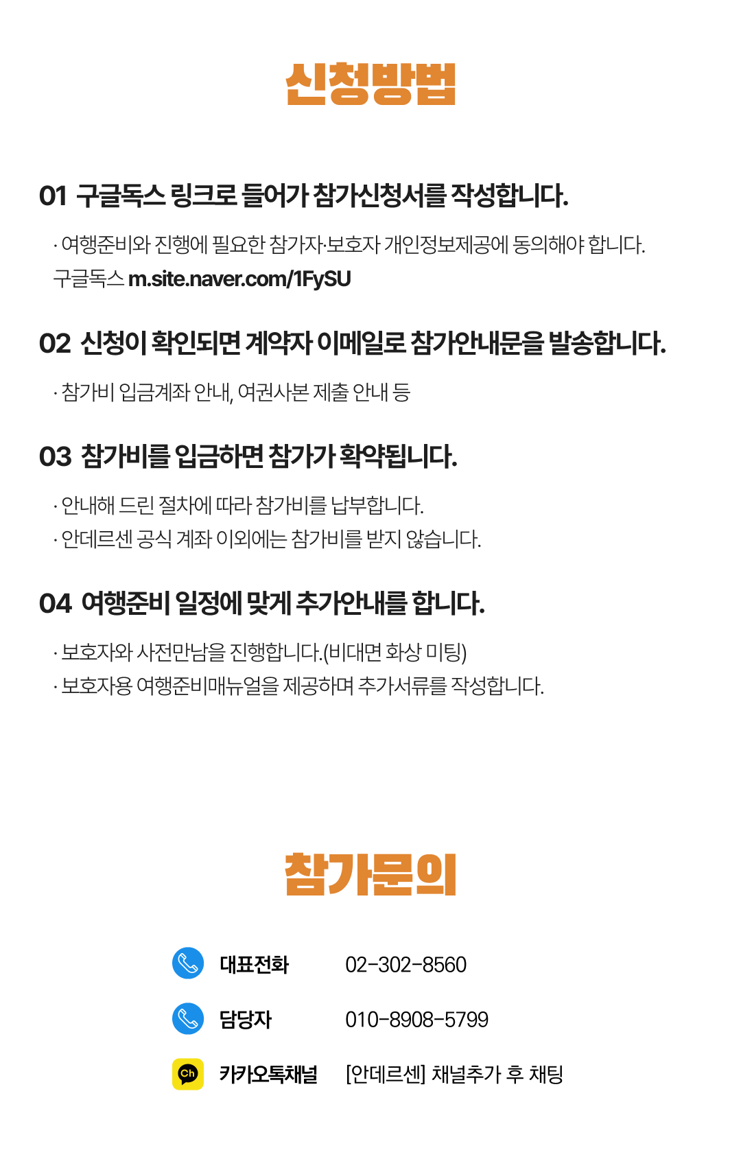 • * 개인용돈(외식·군것질·쇼핑 등)은 교육차원에서 상한선을 두며 추후 안내합니다. * 여권 및 전자여행허가 발급은 개별적으로 진행합니다. * 숙소 및 장비 파손면책보증금(Deposit)이 있습니다. 1인 50유로로 파손이 없을 경우 전액 환급합니다. 여행 출발 한달 전까지 참가비 계좌로 납부하며 여행 종료 한달 후 보호자 계좌로 환급합니다. * 참가비 전액을 카드로 결제할 경우 총 결제금액에서 부가세10%가 추가됩니다. * 5월의 블랙프라이데이 특가 참가비는 안데르센 회원(1회 이상 참가자) 기준이며, 비회원은 1인 5만원의 회원가입비가 있습니다. 회원가입시 안데르센에서 발행한 여행도서 2권을 보내드립니 다. 회원가입비는 환불되지 않습니다.