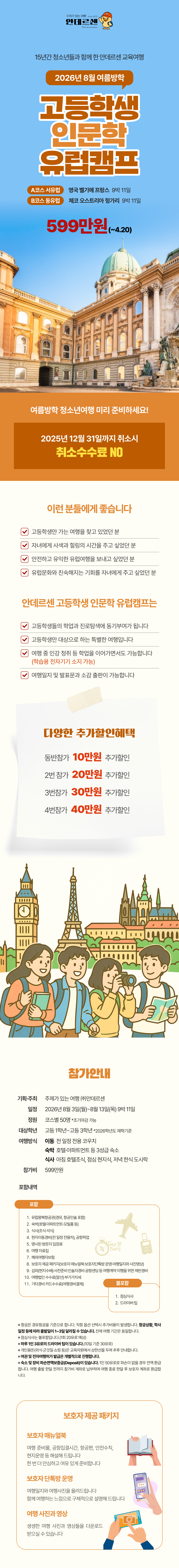 이런 분들에게 좋습니다 □ 고등학생만 가는 여행을 찾고 있었던 분 □ 자녀에게 사색과 힐링의 시간을 주고 싶었던 분 □ 안전하고 유익한 유럽여행을 보내고 싶었던 분 □ 유럽문화와 친숙해지는 기회를 자녀에게 주고 싶었던 분 안데르센 고등학생 인문학 유럽캠프는 □ 고등학생들의 학업과 진로탐색에 동기부여가 됩니다 □ 고등학생만 대상으로 하는 특별한 여행입니다 □ 여행 중 인강 청취 등 학업을 이어가면서도 가능합니다(학습용 전자기기 소지가능) □ 여행일지 및 발표문과 탐방소감 출판이 가능합니다 1. 고등학생 인문학 유럽캠프 A코스 (서유럽) - 일정 : 2026년 8월 3일(월)~8월 13일(목) 9박 11일 - 방문국가 : 영국 벨기에 프랑스 - 방문도시 : 런던·옥스포드(4)-벨기에(1)-파리·오베르쉬르우와즈(4) - 대상학년 : 고등학생 1학년 ~ 고등학생 3학년 (*2026학년도 재학기준) 2. 고등학생 인문학 유럽캠프 B코스 (동유럽) - 일정 : 2026년 8월 3일(월)~8월 13일(목) 9박 11일 - 방문국가 : 오스트리아 체코 헝가리 - 방문도시 : 프라하(3)-부다페스트(3)-비엔나(3) - 대상학년 : 고등학생 1학년 ~ 고등학생 3학년 (*2026학년도 재학기준)