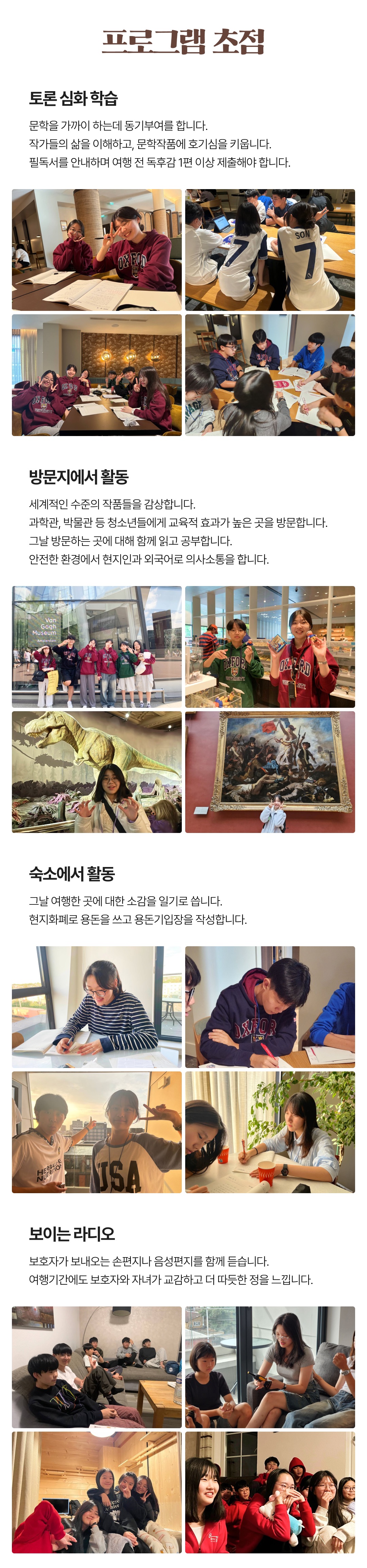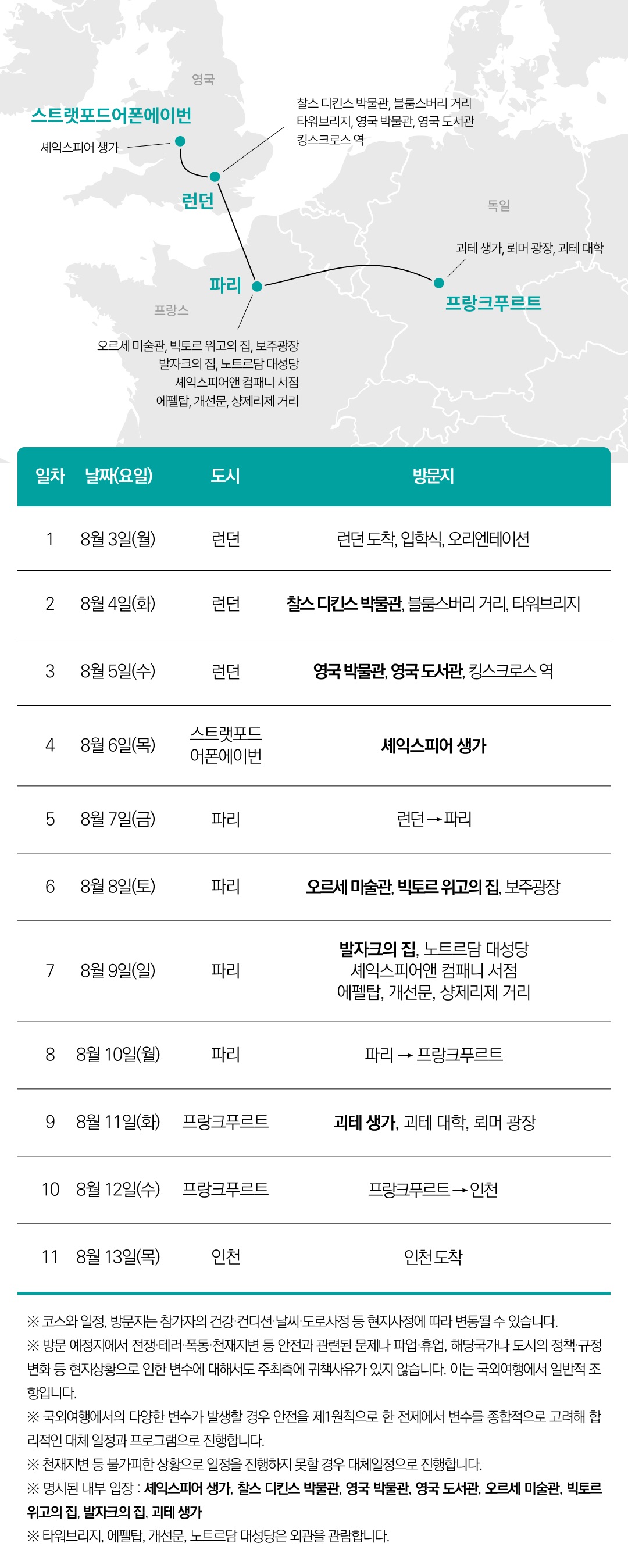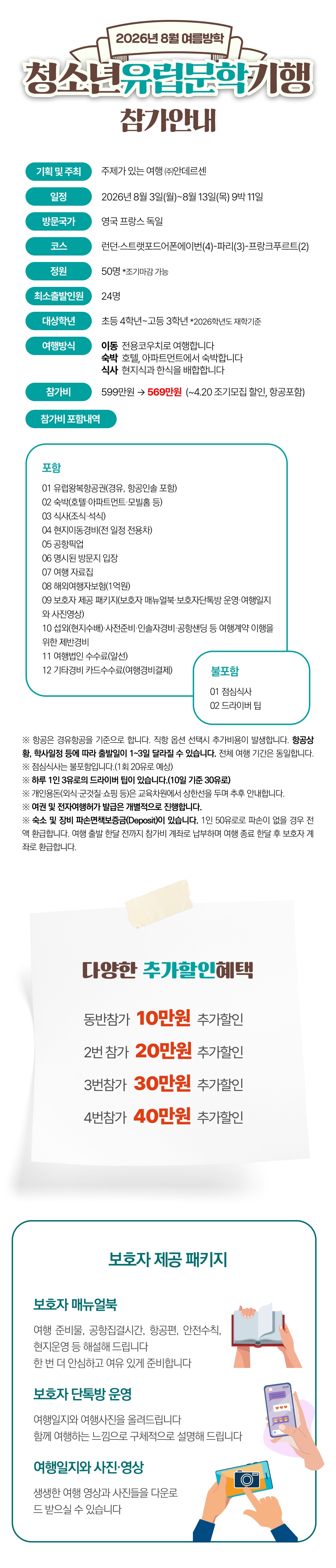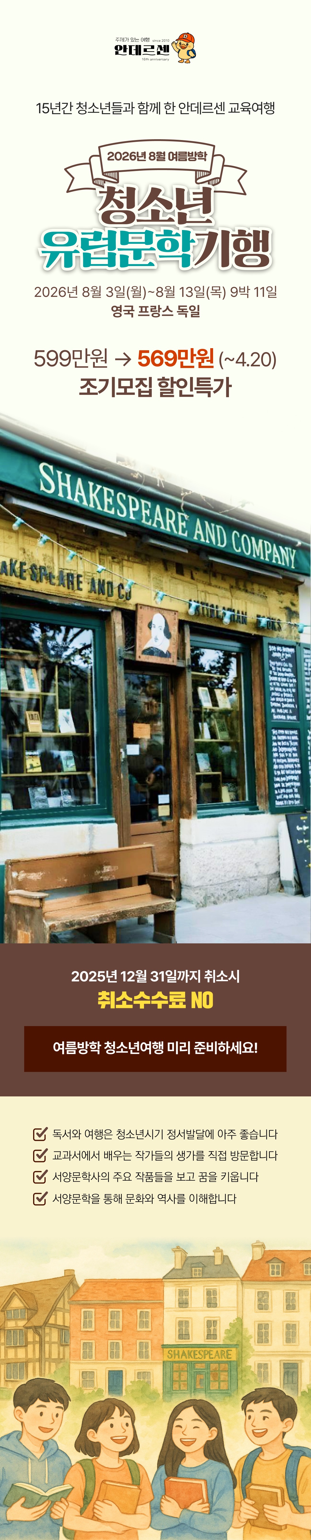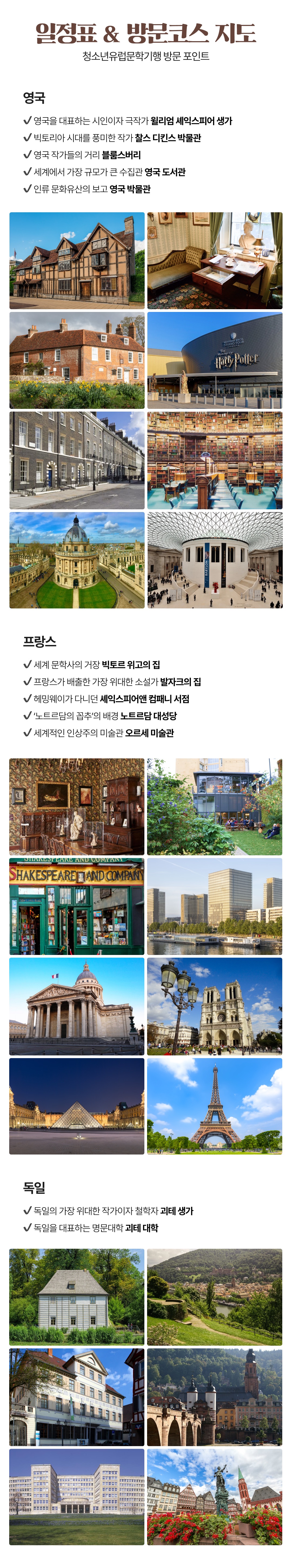 √ 독서와 여행은 청소년 정서발달에 아주 좋습니다 √ 교과서에서 배우는 작가들의 생가를 직접 방문합니다 √ 서양문학사의 주요 작품들을 보고 꿈을 키웁니다 √ 서양문학을 통해 문화와 역사를 이해합니다 일정 : 2026년 8월 3일(월) ~ 8월 13일(목) / 9박 11일 국가 : 영국 프랑스 독일 대상 : 초등 4학년 ~ 고등 3학년 (2026학년도 기준)