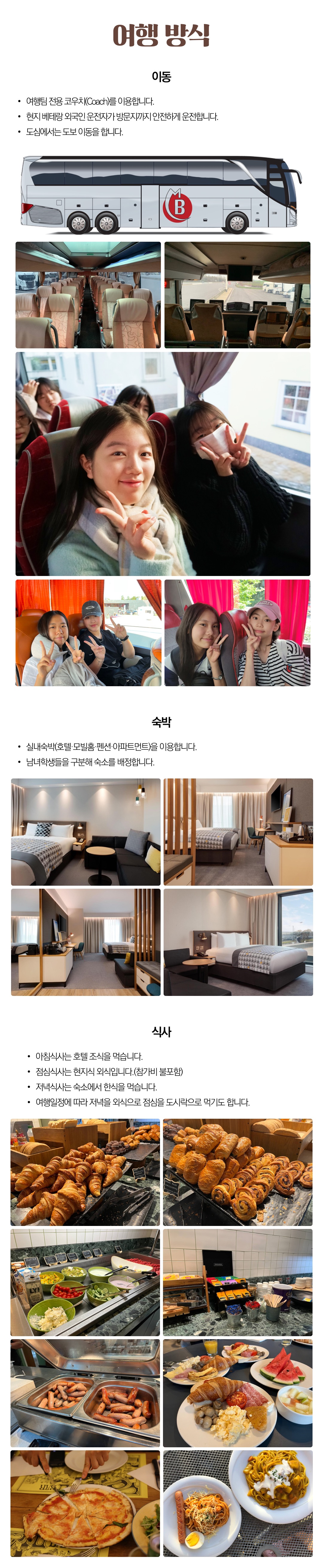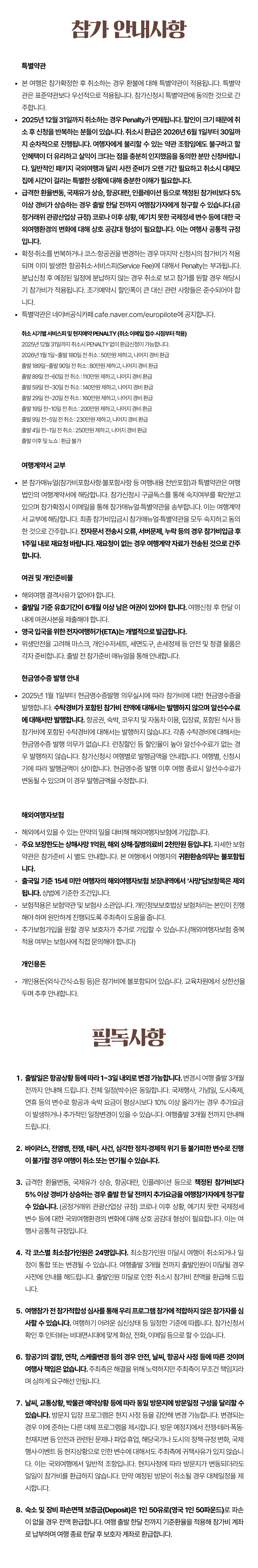 항공은 경유항공을 기준으로 합니다. 직항 옵션 선택시 추가비용이 발생합니다. 항공상황, 학사일정 등에 따라 출발일이 1~3일 달라질 수 있습니다. 전체 여행 기간은 동일합니다.