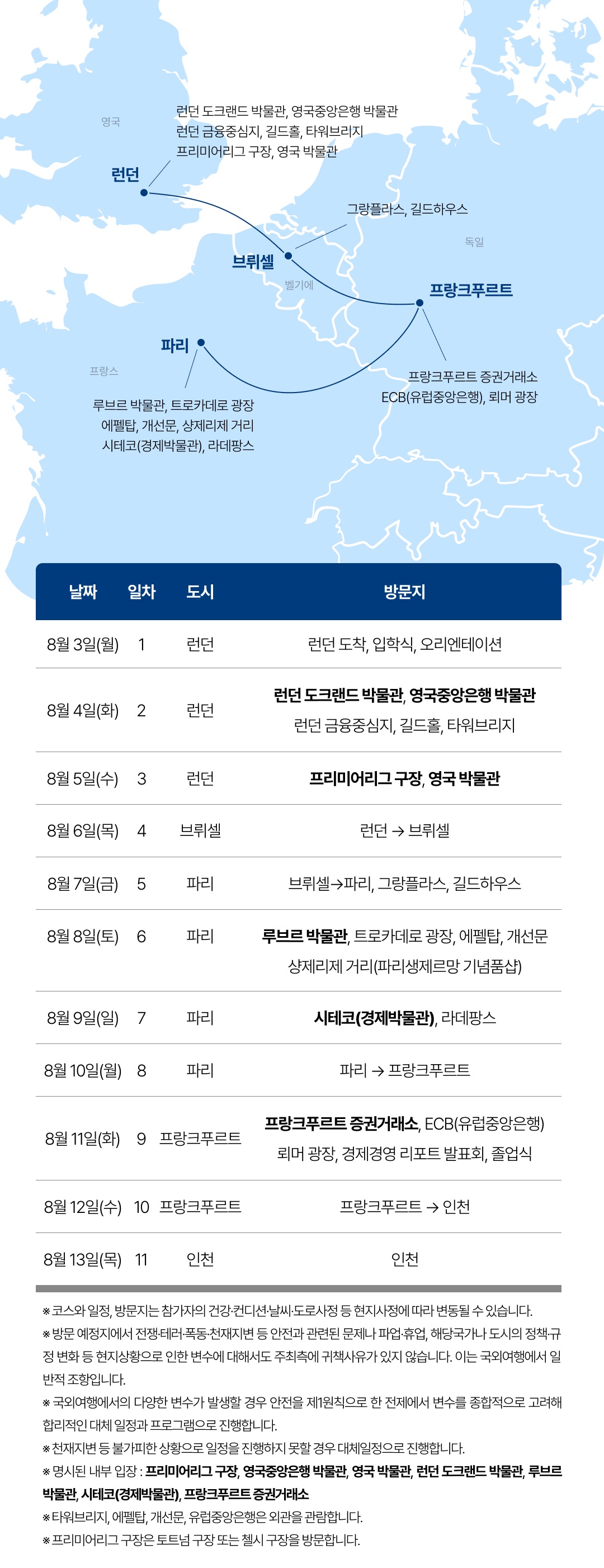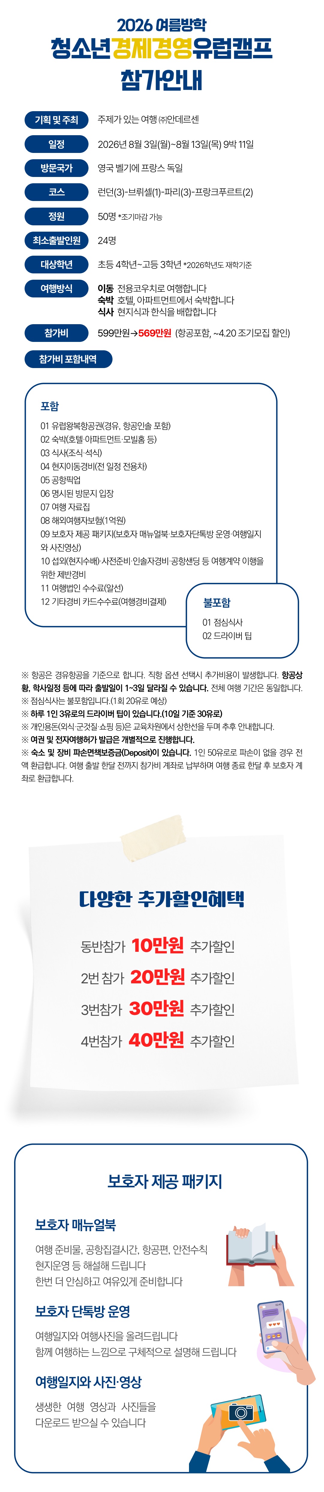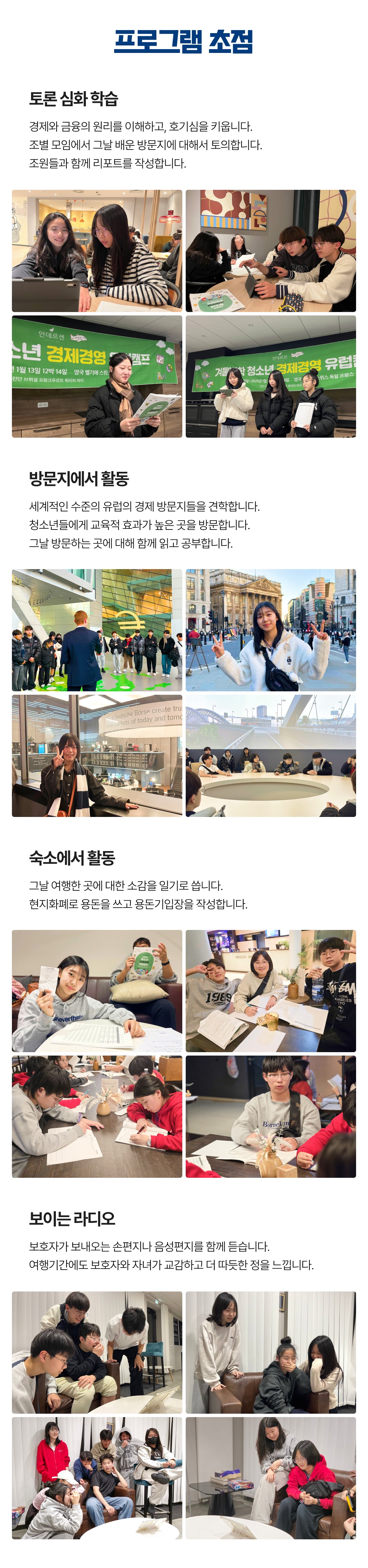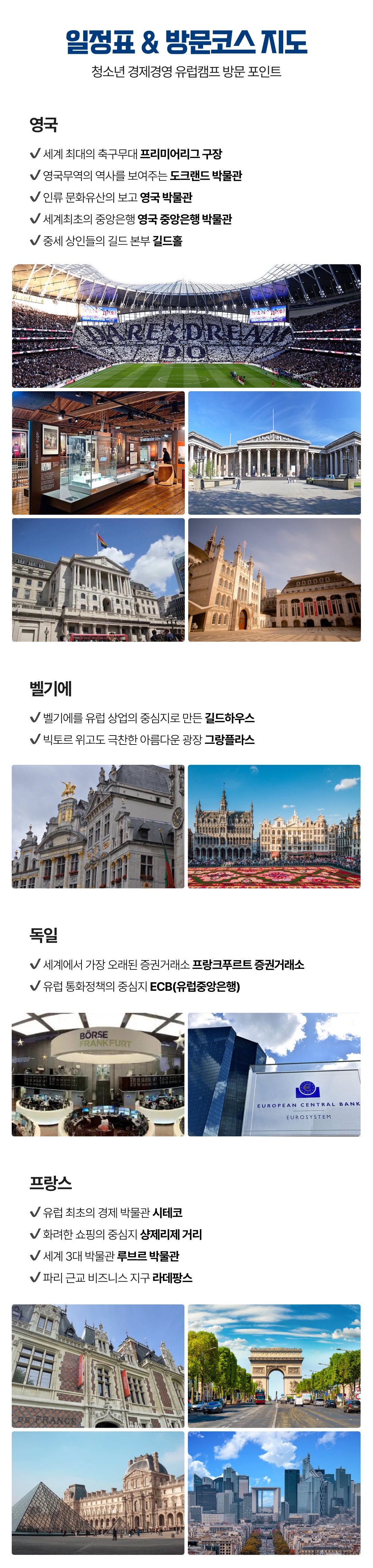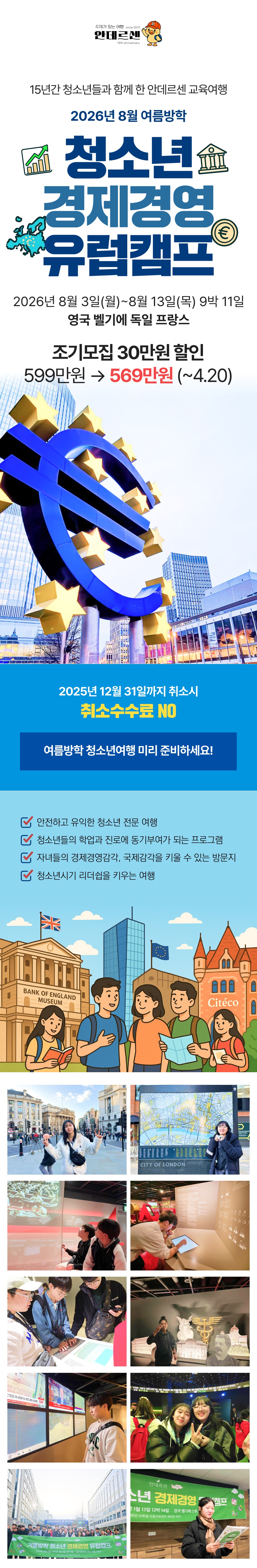 유럽여행을 하며 경제와 금융의 원리를 이해하고, 호기심을 키웁니다 √ 안전하고 유익한 청소년 전문 여행 √ 청소년들의 학업과 진로에 동기부여가 되는 프로그램 √ 자녀들의 경제경영감각, 국제감각을 키울 수 있는 방문지 √ 청소년시기 리더쉽을 키우는 여행 기획·주최 : 주제가 있는 여행 ㈜안데르센 일정 : 2026년 8월 3일(월)~8월 13일(목) 9박 11일 방문국가 : 영국 벨기에 프랑스 독일 대상 : 초등 4학년~고등 3학년 (2026학년도 기준) 최소출발인원 : 24명