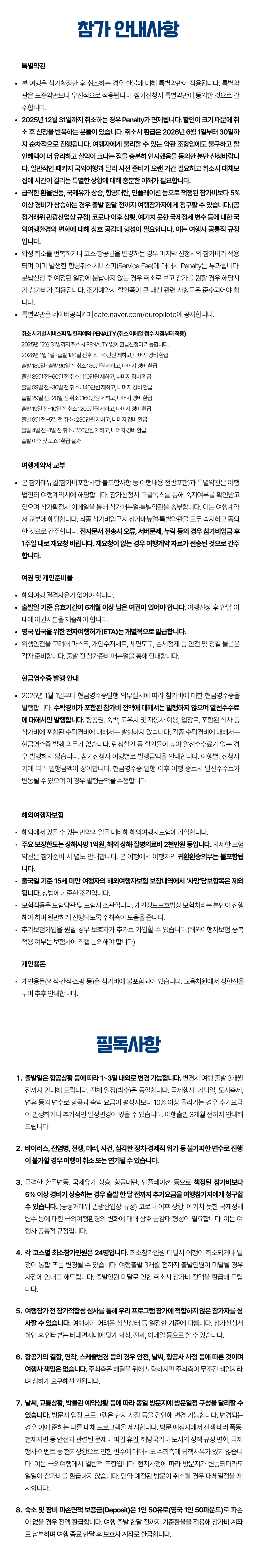 • * 개인용돈(외식·군것질·쇼핑 등)은 교육차원에서 상한선을 두며 추후 안내합니다. * 여권 및 전자여행허가 발급은 개별적으로 진행합니다. * 숙소 및 장비 파손면책보증금(Deposit)이 있습니다. 1인 50유로로 파손이 없을 경우 전액 환급합니다. 여행 출발 한달 전까지 참가비 계좌로 납부하며 여행 종료 한달 후 보호자 계좌로 환급합니다. * 참가비 전액을 카드로 결제할 경우 총 결제금액에서 부가세 10%가 추가됩니다.