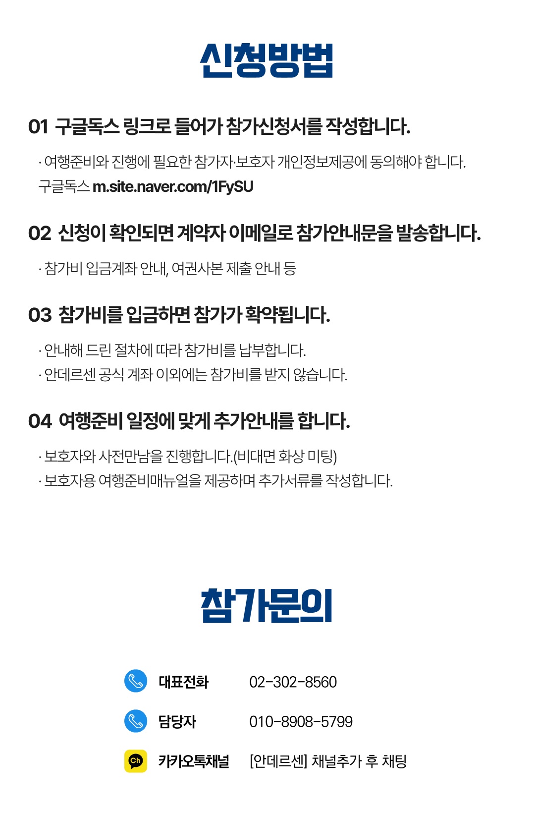 상세한 여행준비를 위해 구글 참가신청서를 작성해주셔야 합니다. 구글독스 참가신청서를 작성하지 않으면 정상적으로 예약이 접수되지 않습니다. 클릭하면 바로 구글 참가신청서로 연결됩니다.