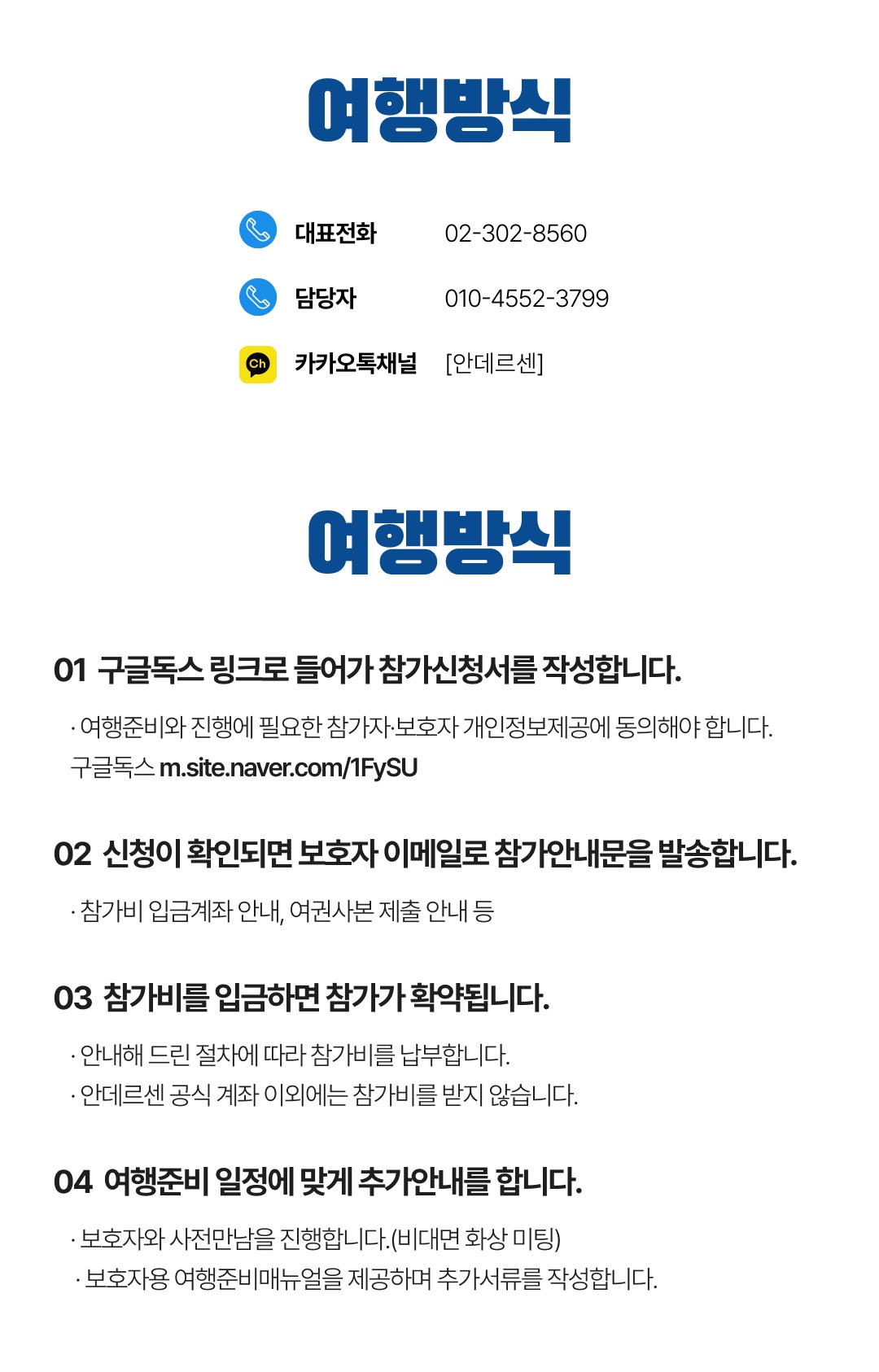 상세한 여행준비를 위해 구글 참가신청서를 작성해주셔야 합니다. 구글독스 참가신청서를 작성하지 않으면 정상적으로 예약이 접수되지 않습니다. 클릭하면 바로 구글 참가신청서로 연결됩니다.