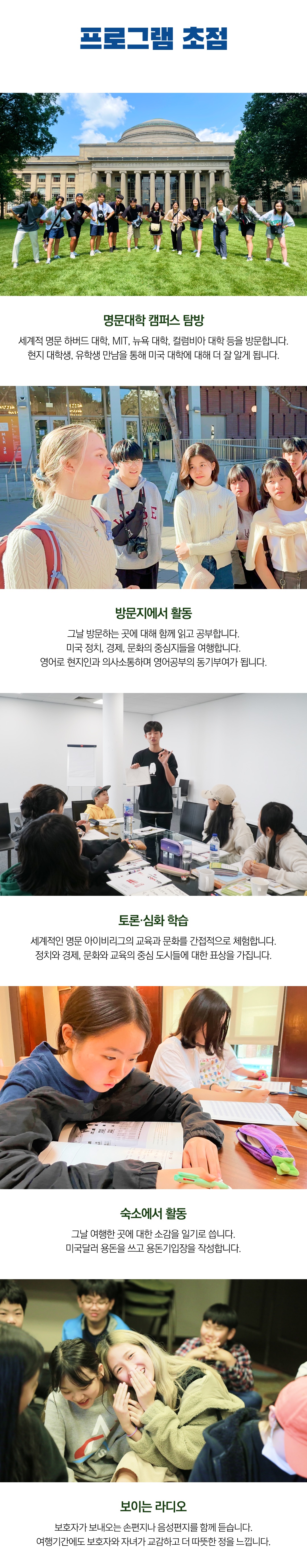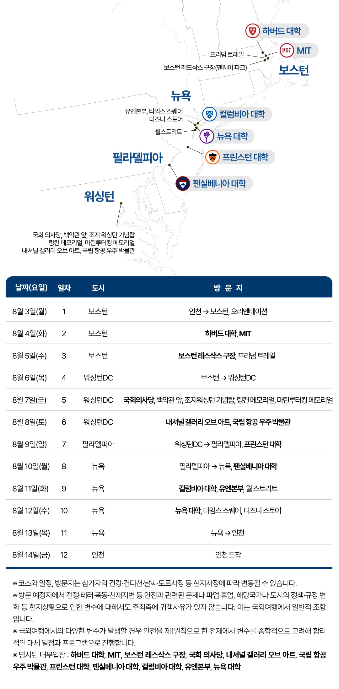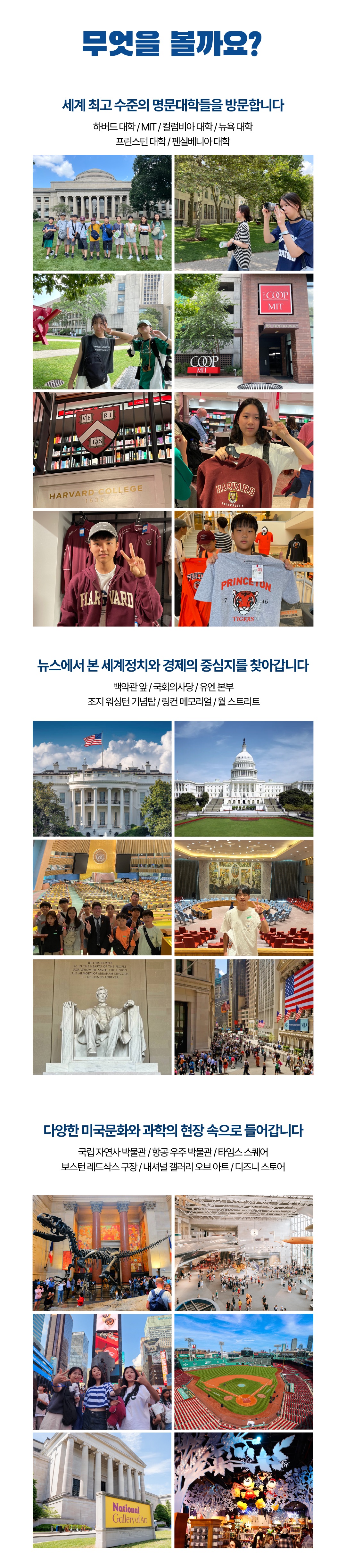 💬보호자 후기 중 “안데르센을 조금 일찍 알았더라면 이 좋은 프로그램을 방학 때마다 보내고 싶다는 생각도 했습니다” √ 하버드대 등 세계적인 명문 아이비리그 대학들을 탐방 √ 미국의 정치, 경제, 문화의 중심지들 방문 √ 미래를 위한 투자, 청소년 시절 제대로 된 해외경험 √ 뉴욕, 보스턴, 워싱턴DC, 필라델피아 미 동부 주요도시 견학 2026 여름방학 청소년 미국 아이비 캠프 기획·주최 : 주제가 있는 여행 ㈜안데르센 일정 : 2026년 8월 3일(월)~8월 14일(금) 10박 12일 대상 : 초등 4학년~고등 3학년 (2026학년도 기준) 국가 : 미국 코스 : 보스턴(3)–워싱턴DC(3)–필라델피아(1)-뉴욕(3) ★ 주요 방문지 : 하버드 대학, MIT, 보스턴 레스삭스 구장, 국회 의사당, 내셔널 갤러리 오브 아트, 국립 항공 우주 박물관, 프린스턴 대학, 펜실베니아 대학, 컬럼비아 대학, 유엔본부, 뉴욕 대학