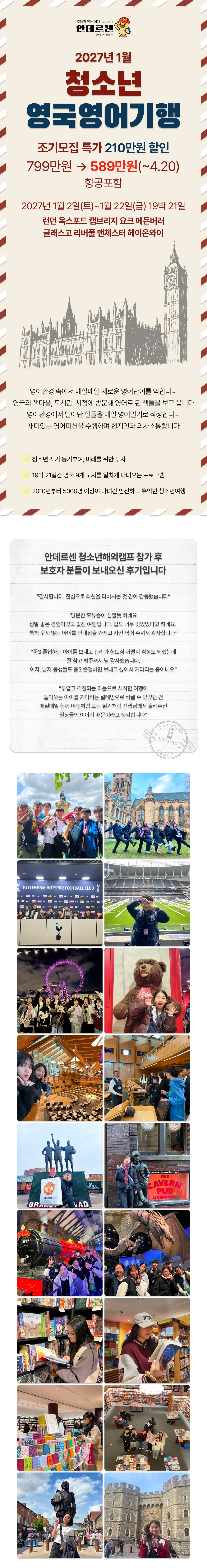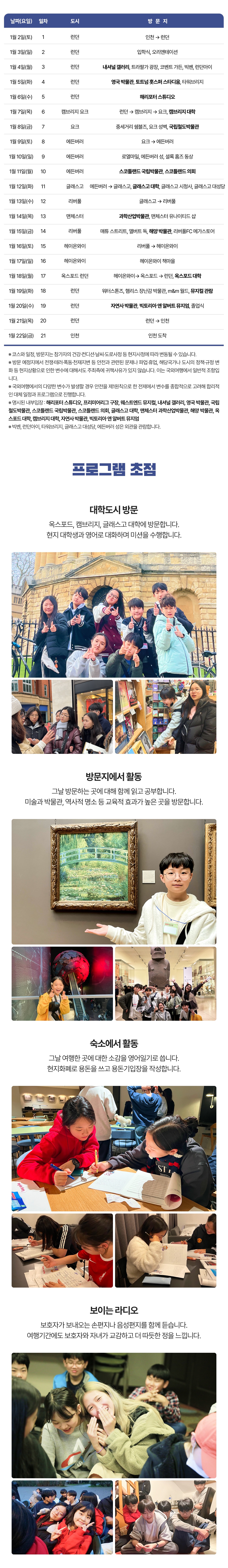영어환경 속에서 매일매일 새로운 영어단어를 익힙니다. 영국의 책마을, 도서관, 서점에 방문해 영어로 된 책들을 보고 옵니다. 영어환경에서 일어난 일들을 매일 영어일기로 작성합니다. 재미있는 영어미션을 수행하며 현지인과 의사소통합니다. □ 청소년 시기 동기부여, 미래를 위한 투자 □ 19박 21일간 영국 9개 도시를 알차게 다녀오는 프로그램 □ 2010년부터 5,000명 이상이 다녀간 안전하고 유익한 청소년여행 - 일정: 2027년 1월 2일(토)~1월 22일(금) 19박 21일 - 방문국가: 영국 - 방문코스: 런던 옥스포드 캠브리지 요크 에든버러 글래스고 리버풀 맨체스터 헤이온와이