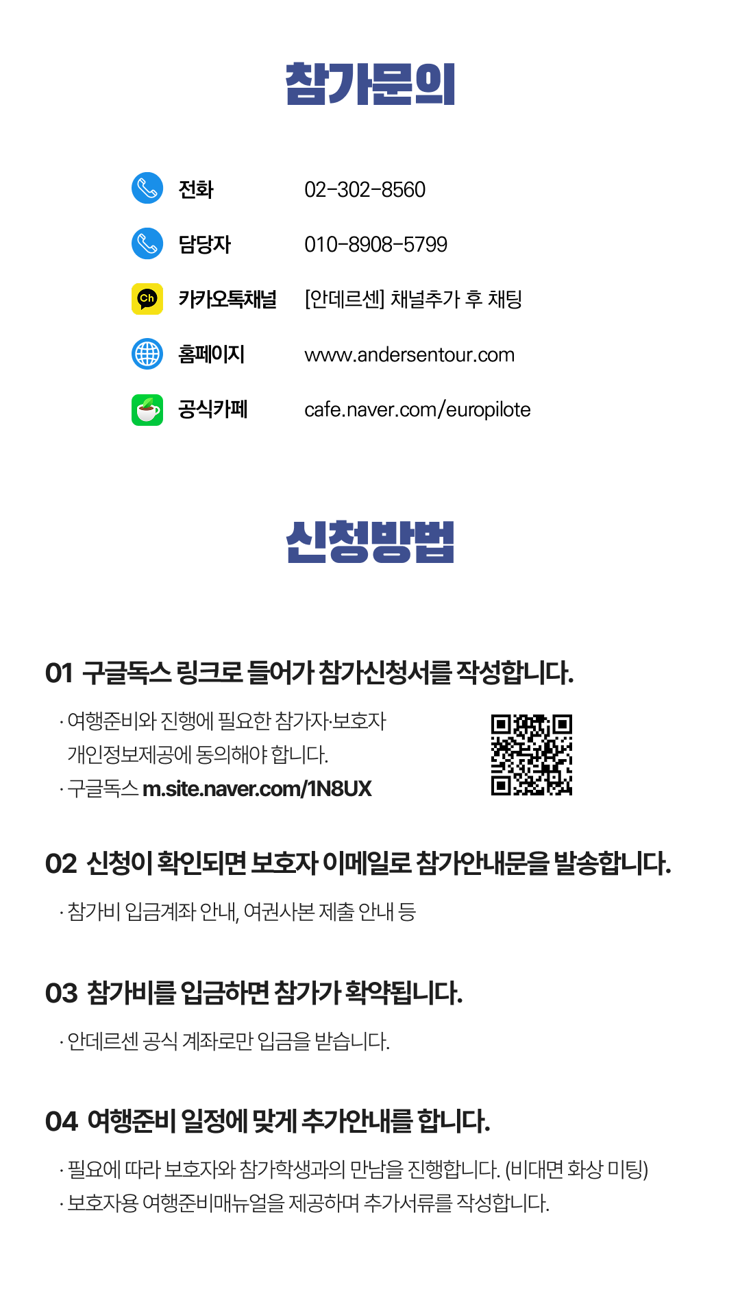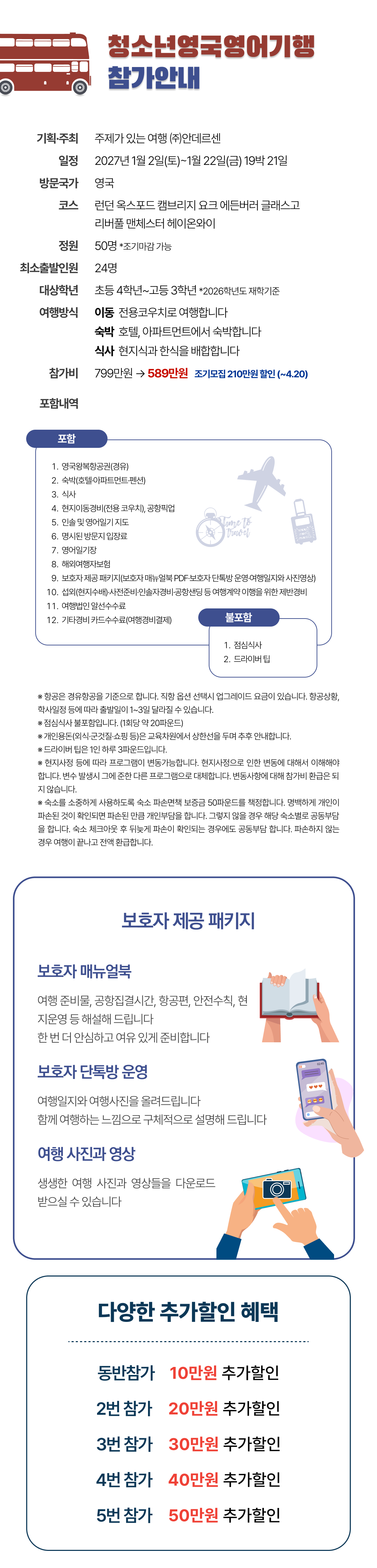 • ※ 개인용돈(외식•군것질·쇼핑 등)은 교육차원에서 상한선을 두며 추후 안내합니다. ※ 현지사정 등에 따라 프로그램이 변동가능합니다. 현지사정으로 인한 변동에 대해서 이해해야 합니다. 변수 발생시 그에 준한 다른 프로그램으로 대체합니다. 변동사항에 대해 참가비 환급은 되지 않습니다. ※ 숙소를 소중하게 사용하도록 숙소 파손면책 보증금 50파운드를 책정합니다. 명백하게 개인이 파손된 것이 확인되면 파손된 만큼 개인부담을 합니다. 그렇지 않을 경우 해당 숙소별로 공동부담 을 합니다. 숙소 체크아웃 후 뒤늦게 파손이 확인되는 경우에도 공동부담 합니다. 파손하지 않는 경우 여행이 끝나고 전액 환급합니다. ※ 안데르센 회원가 기준, 비회원 10만원 회원가입비 (회원가입비는 환급 불가)