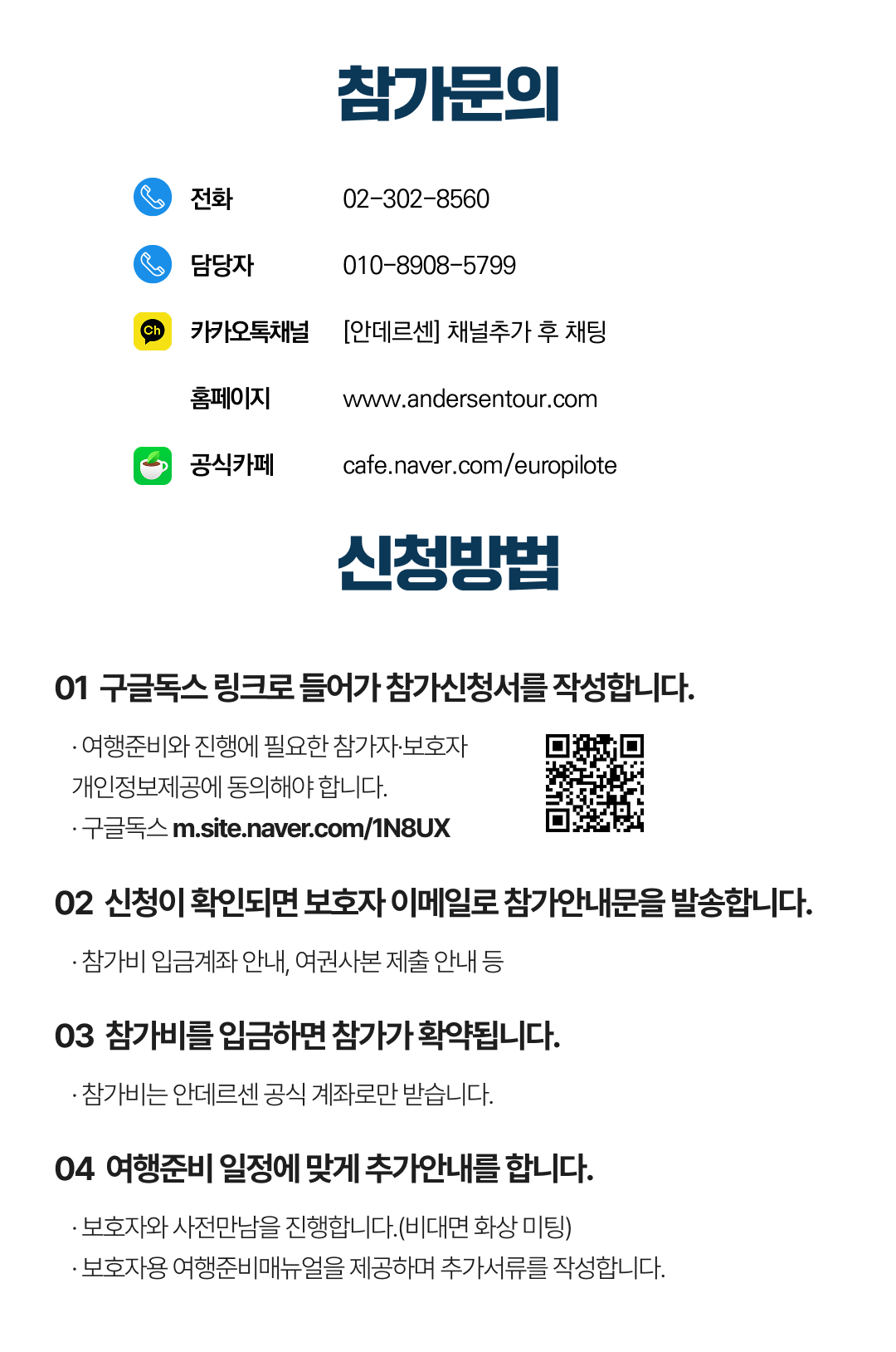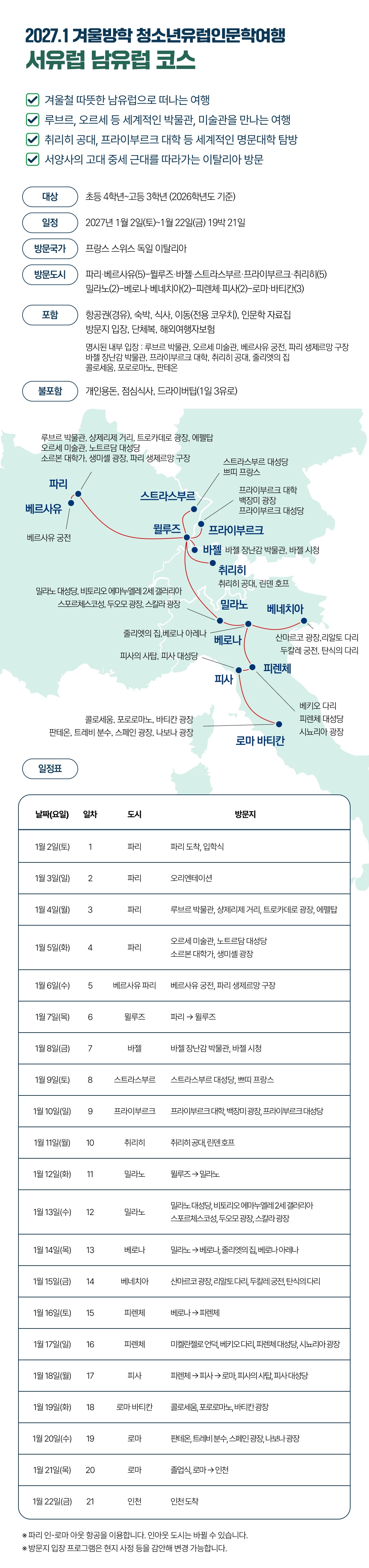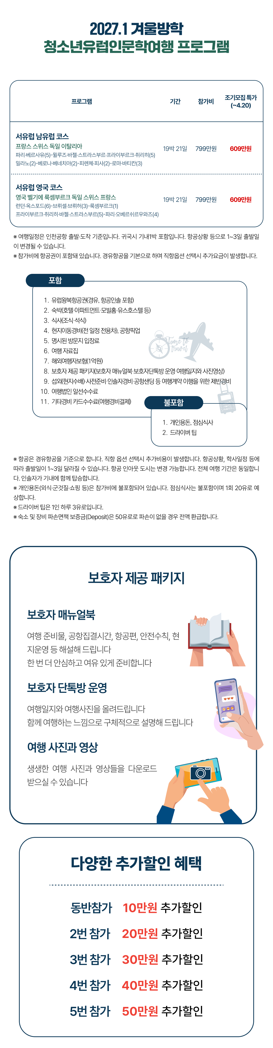 안전한 여행을 위해 주최측은 외교부 해외안전여행, 현지언론보도 등을 예의주시하며 예기치 않은 상황발생시에도 빠르게 조치를 취하고 있습니다. 이와 별도로 여행참가 전 해당 방문국의 여행안전경보, 예방접종 등과 관련해서는 보호자와 여행자 각자가 판단해야 합니다. 외교부 해외안전여행, 해외여행 질병정보 등의 사이트를 확인바랍니다. 어플을 설치하셔서 실시간 확인하는 것이 좋습니다. 비의료인은 의료조치를 할 수 없습니다. 주최측은 예방접종 등 의료적 권고는 하지 않습니다. 여행자가 스스로 판단해 진행 바랍니다.