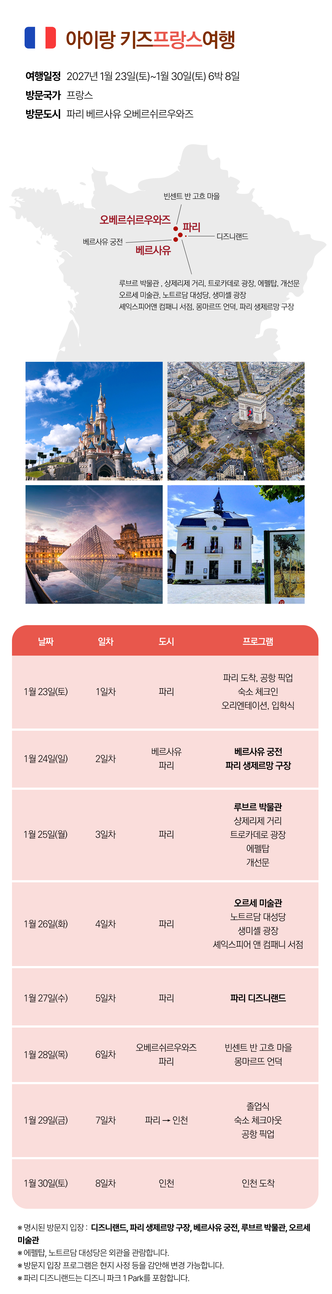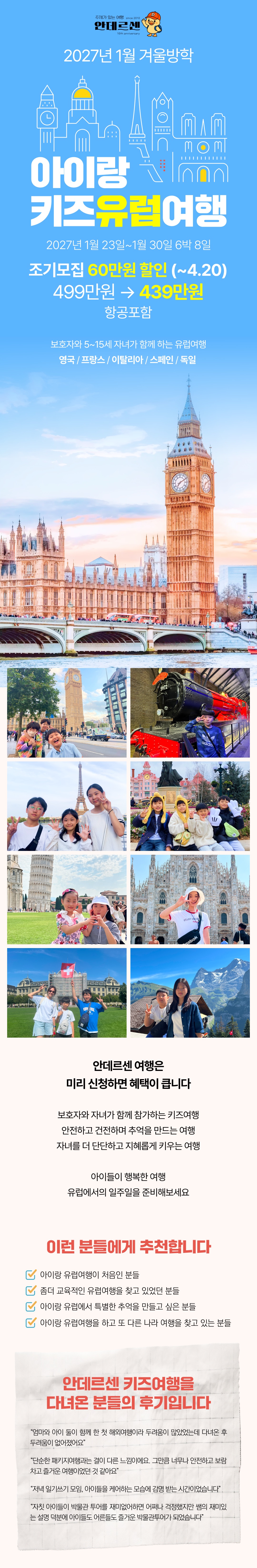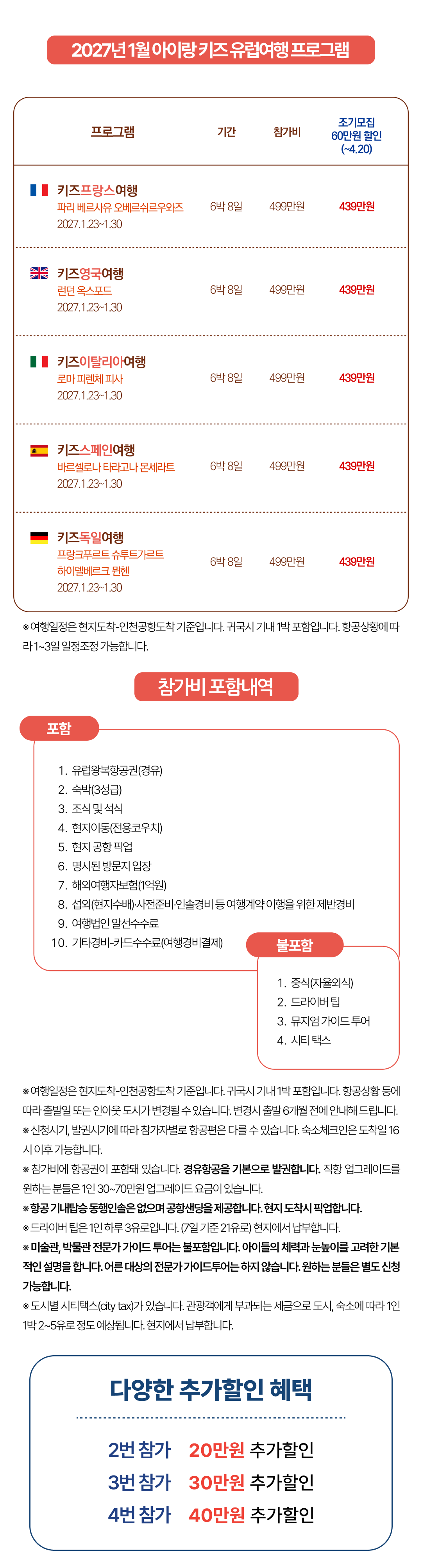 이런 분들에게 추천합니다! * 아이랑 유럽여행이 처음인 분들 * 좀 더 교육적인 유럽여행을 찾고 있었던 분들 * 아이랑 유럽에서 특별한 추억을 만들고 싶은 분들 * 아이랑 유럽여행을 하고 또 다른 나라 여행을 찾고 있는 분들 1. 키즈 프랑스여행 - 여행일정 : 2027년 1월 23일(토) ~ 1월 30일(토) 6박 8일 - 방문도시 : 파리 베르사유 오베르쉬르우와즈 2. 키즈 영국여행 - 여행일정 : 2027년 1월 23일(토) ~ 1월 30일(토) 6박 8일 - 방문도시 : 런던 옥스포드 3. 키즈 이탈리아여행 - 여행일정 : 2027년 1월 23일(토) ~ 1월 30일(토) 6박 8일 - 방문도시 : 로마 피렌체 피사 4. 키즈 스페인여행 - 여행일정 : 2027년 1월 23일(토) ~ 1월 30일(토) 6박 8일 - 방문도시 : 바르셀로나 타라고나 몬세라트 5. 키즈 독일여행 - 여행일정 : 2027년 1월 23일(토) ~ 1월 30일(토) 6박 8일 - 방문도시 : 프랑크푸르트 슈투트가르트 하이델베르크 뮌헨