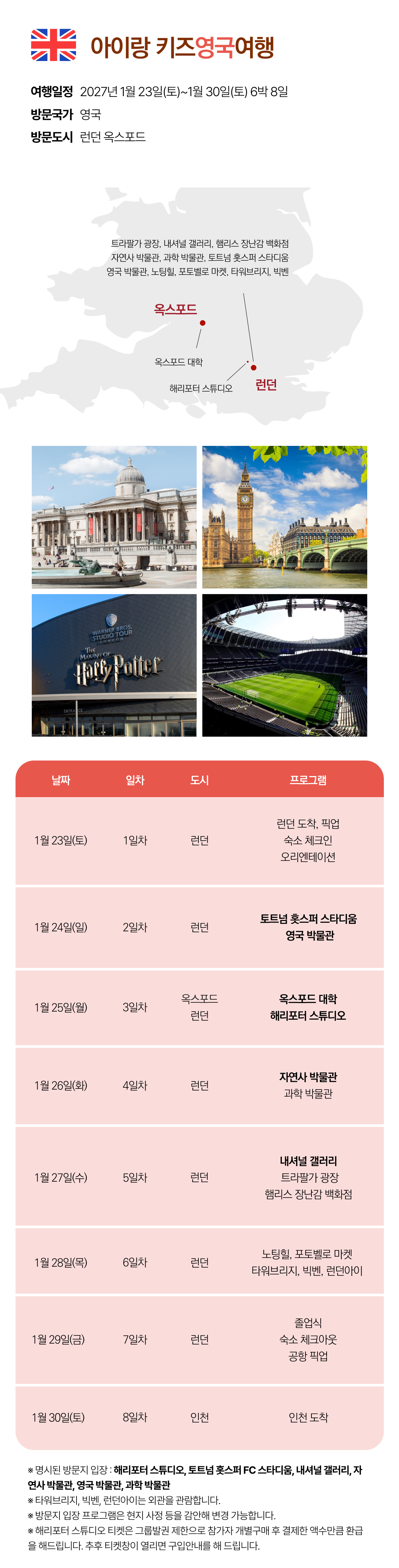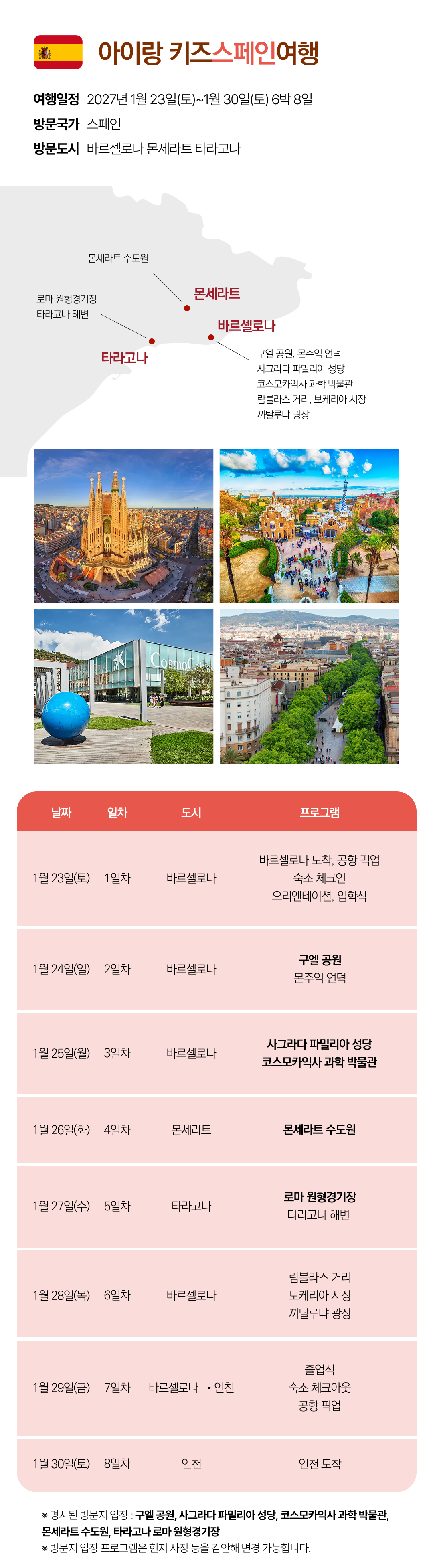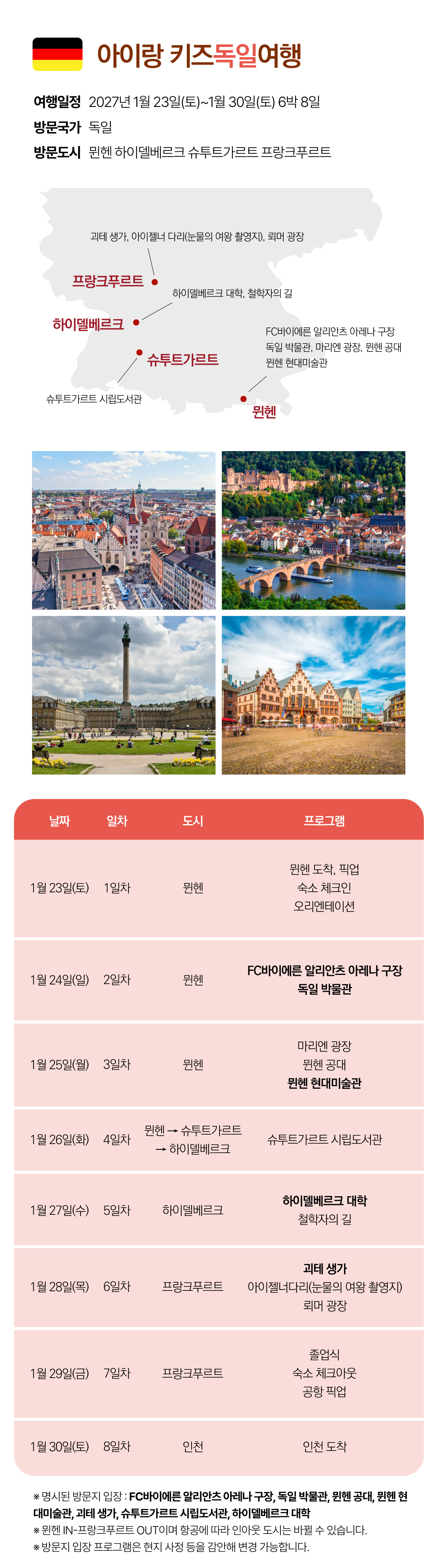 이런 분들에게 추천합니다! * 아이랑 유럽여행이 처음인 분들 * 좀 더 교육적인 유럽여행을 찾고 있었던 분들 * 아이랑 유럽에서 특별한 추억을 만들고 싶은 분들 * 아이랑 유럽여행을 하고 또 다른 나라 여행을 찾고 있는 분들 1. 키즈 프랑스여행 - 여행일정 : 2027년 1월 23일(토) ~ 1월 30일(토) 6박 8일 - 방문도시 : 파리 베르사유 오베르쉬르우와즈 2. 키즈 영국여행 - 여행일정 : 2027년 1월 23일(토) ~ 1월 30일(토) 6박 8일 - 방문도시 : 런던 옥스포드 3. 키즈 이탈리아여행 - 여행일정 : 2027년 1월 23일(토) ~ 1월 30일(토) 6박 8일 - 방문도시 : 로마 피렌체 피사 4. 키즈 스페인여행 - 여행일정 : 2027년 1월 23일(토) ~ 1월 30일(토) 6박 8일 - 방문도시 : 바르셀로나 타라고나 몬세라트 5. 키즈 독일여행 - 여행일정 : 2027년 1월 23일(토) ~ 1월 30일(토) 6박 8일 - 방문도시 : 프랑크푸르트 슈투트가르트 하이델베르크 뮌헨