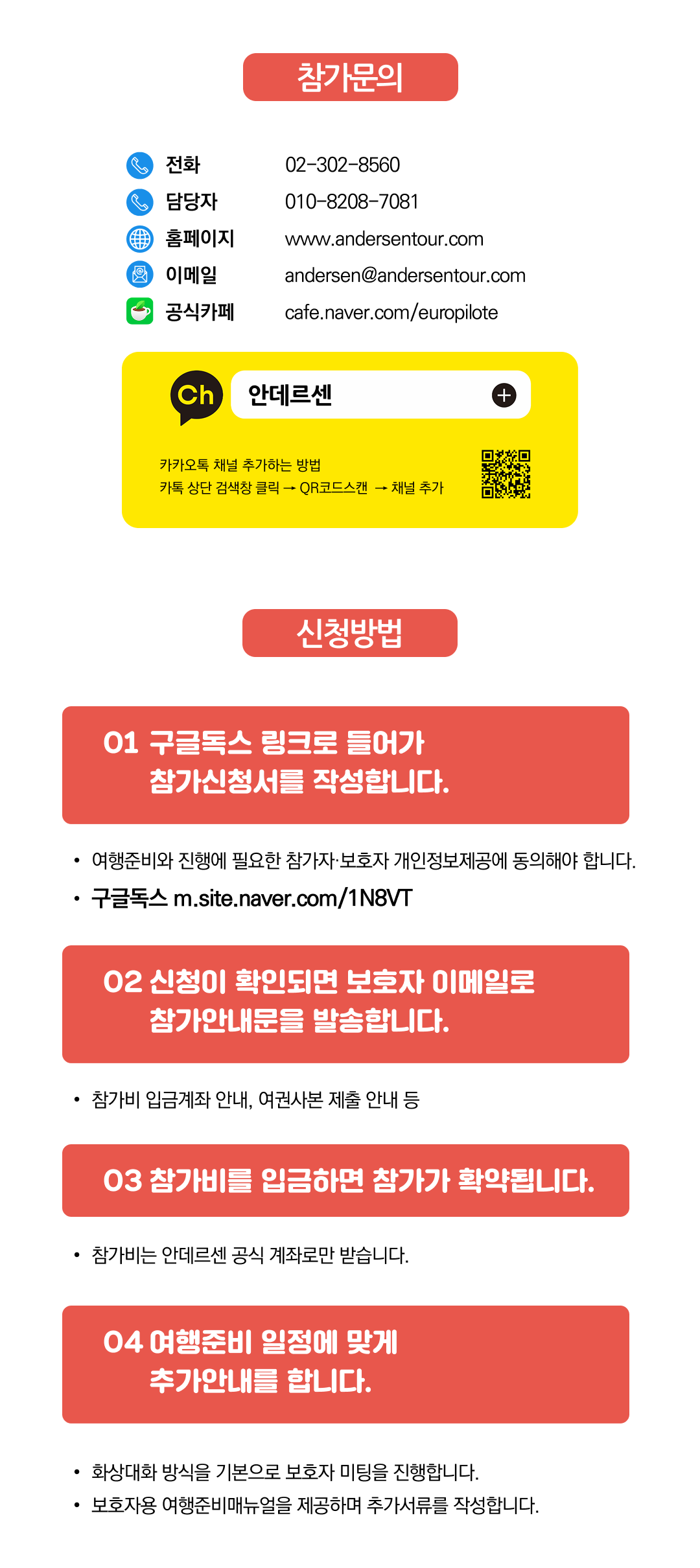 상세한 여행준비를 위해 구글 참가신청서를 작성해주셔야 합니다. 구글독스 참가신청서를 작성하지 않으면 정상적으로 예약이 접수되지 않습니다. 클릭하면 바로 구글 참가신청서로 연결됩니다.