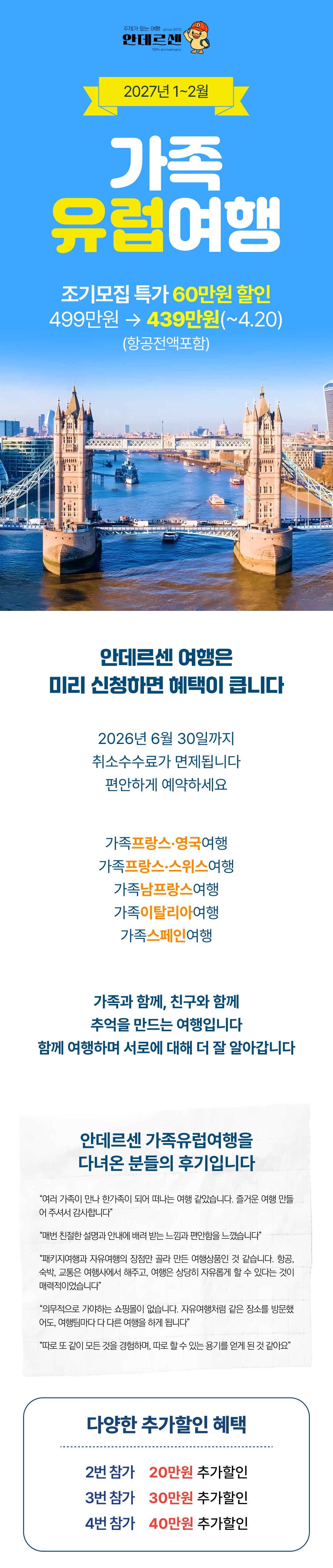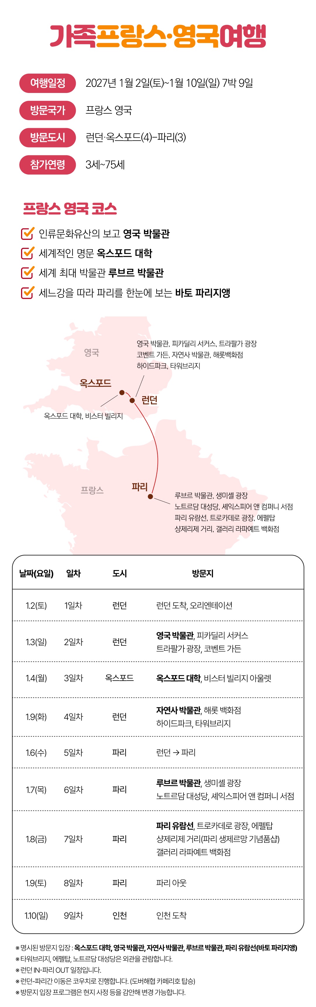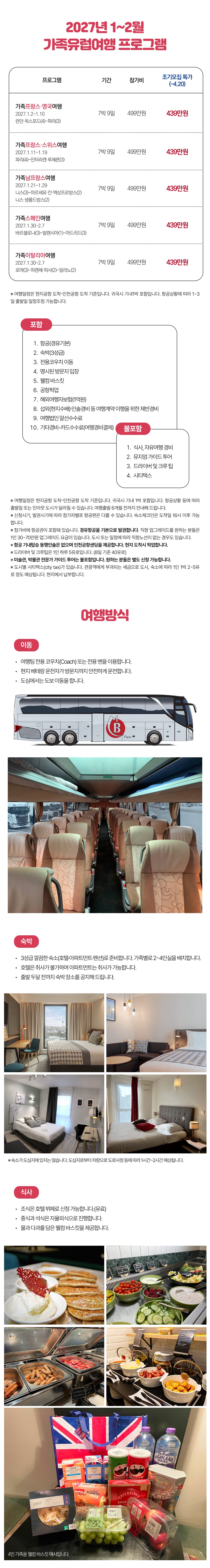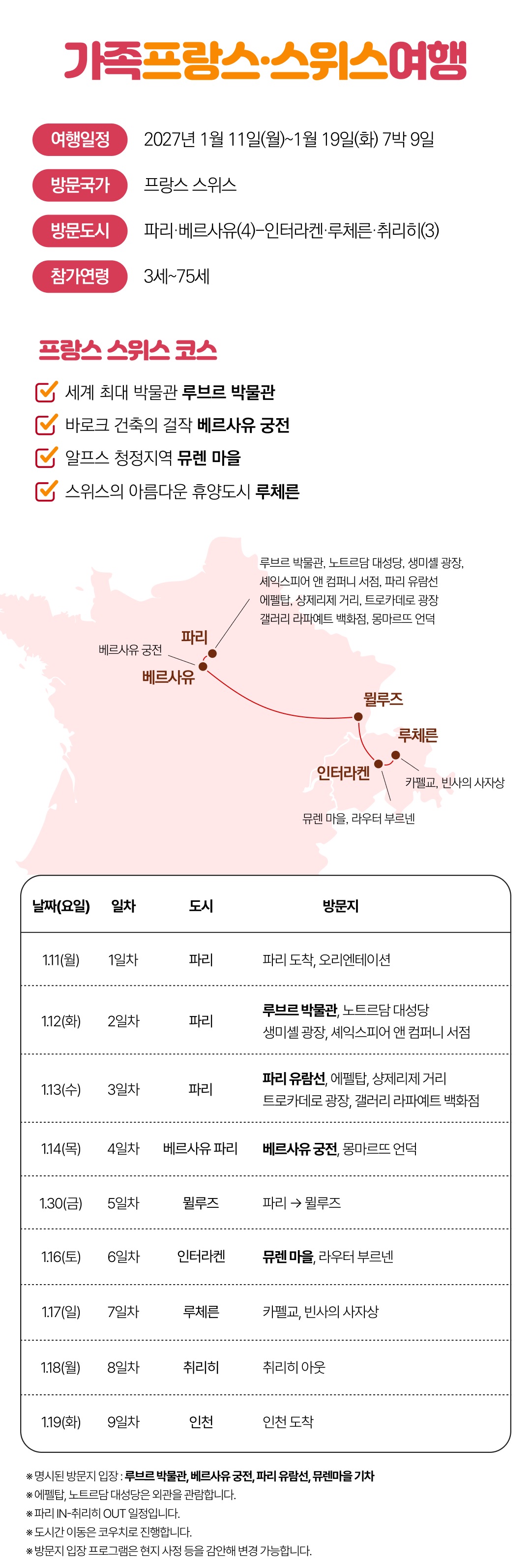 가족과 함께, 친구와 함께 추억을 만드는 여행! 함께 여행하며 서로에 대해 더 잘 알아갑니다. - 패키지여행과 자유여행의 장점을 살린 여행 - 방문지에서 자유롭게 여행하고, 이동은 안전하고 편안하게 - 무리하게 찍고 다니는 일정은 NO! 여유를 가지면서도 알찬 일정으로 따뜻하고 소중한 추억을 만드세요. 1. 가족 프랑스·영국 여행 - 여행일정 : 2027년 1월 2일(토)~1월 10일(일) 7박 9일 - 방문국가 : 프랑스 영국 - 방문도시 : 런던·옥스포드(4)-파리(3) 2. 가족 프랑스·스위스 여행 - 여행일정 : 2027년 1월 11일(월)~1월 19일(화) 7박 9일 - 방문국가 : 프랑스 스위스 - 방문도시 : 파리·베르사유(4)-인터라켄·루체른·취리히(3) 3. 가족 남프랑스 여행 - 여행일정 : 2027년 1월 21일(목)~1월 29일(금) 7박 9일 - 방문국가 : 프랑스 - 방문도시 : 니스(3)-마르세유·칸·엑상프로방스(2)-니스·생폴드방스(2) 4. 가족 이탈리아 여행 - 여행일정 : 2027년 1월 30일(토)~2월 7일(일) 7박 9일 - 방문국가 : 이탈리아 - 방문도시 : 로마·바티칸(3)-피렌체·피사(2)-밀라노(2) 5. 가족 스페인 여행 - 여행일정 : 2027년 1월 30일(토)~2월 7일(일) 7박 9일 - 방문국가 : 스페인 - 방문도시 : 바르셀로나(3)-발렌시아(1)-마드리드(3)