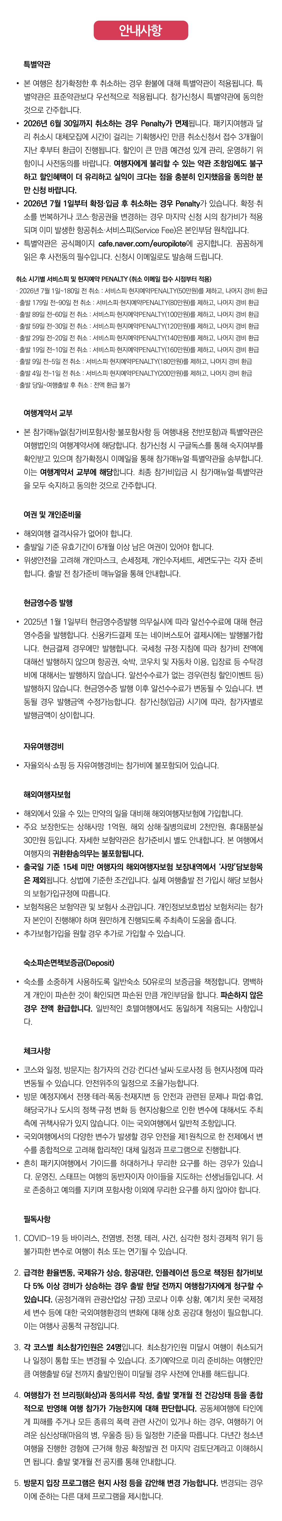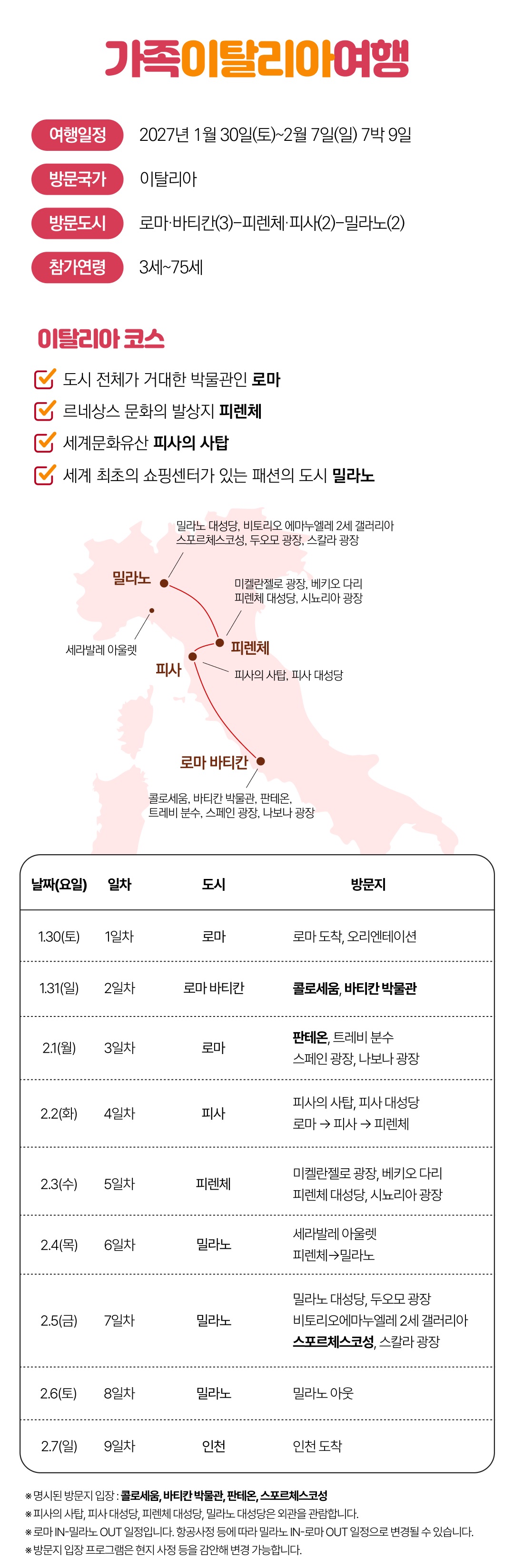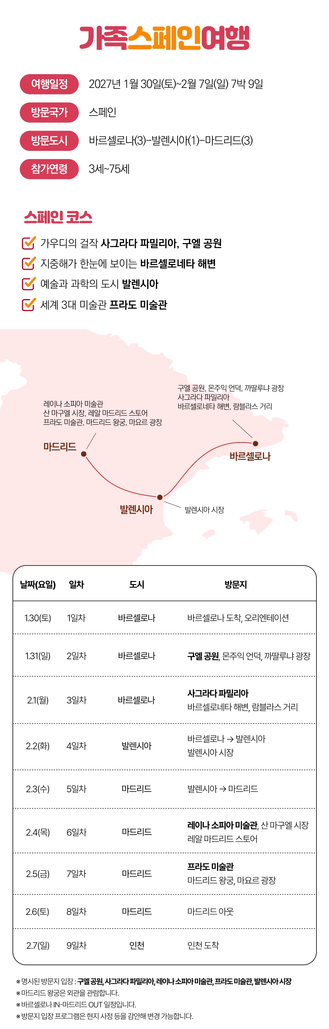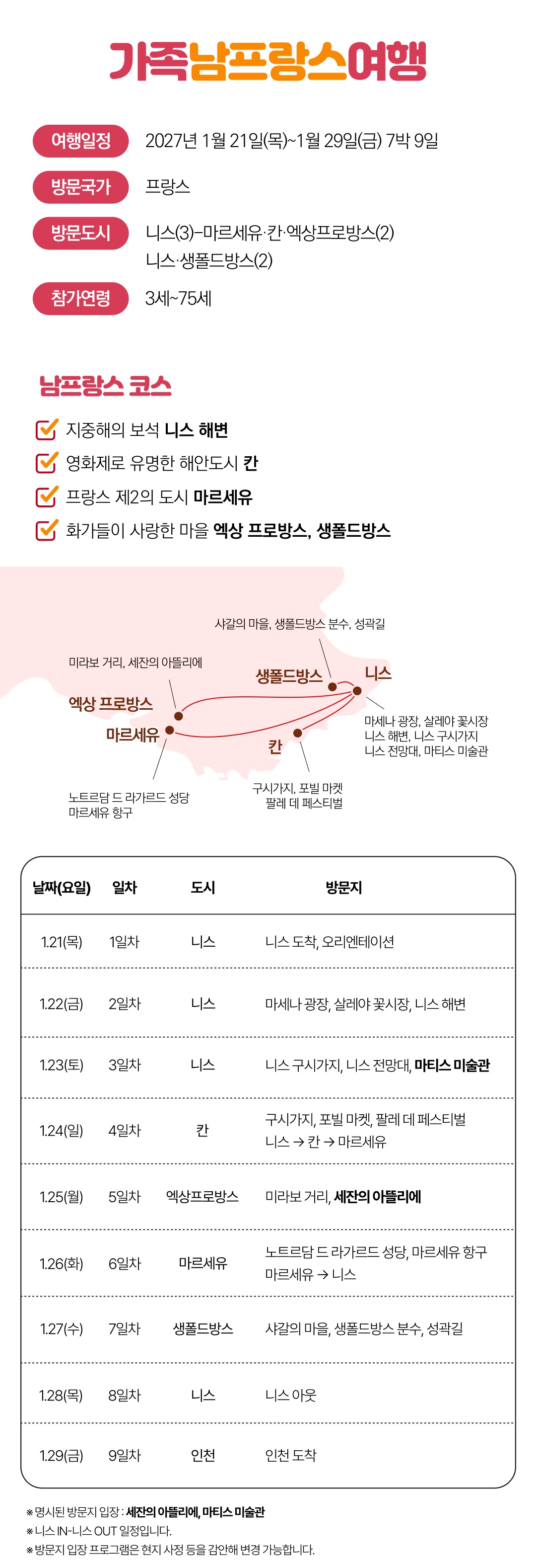 가족과 함께, 친구와 함께 추억을 만드는 여행! 함께 여행하며 서로에 대해 더 잘 알아갑니다. - 패키지여행과 자유여행의 장점을 살린 여행 - 방문지에서 자유롭게 여행하고, 이동은 안전하고 편안하게 - 무리하게 찍고 다니는 일정은 NO! 여유를 가지면서도 알찬 일정으로 따뜻하고 소중한 추억을 만드세요. 1. 가족 프랑스·영국 여행 - 여행일정 : 2027년 1월 2일(토)~1월 10일(일) 7박 9일 - 방문국가 : 프랑스 영국 - 방문도시 : 런던·옥스포드(4)-파리(3) 2. 가족 프랑스·스위스 여행 - 여행일정 : 2027년 1월 11일(월)~1월 19일(화) 7박 9일 - 방문국가 : 프랑스 스위스 - 방문도시 : 파리·베르사유(4)-인터라켄·루체른·취리히(3) 3. 가족 남프랑스 여행 - 여행일정 : 2027년 1월 21일(목)~1월 29일(금) 7박 9일 - 방문국가 : 프랑스 - 방문도시 : 니스(3)-마르세유·칸·엑상프로방스(2)-니스·생폴드방스(2) 4. 가족 이탈리아 여행 - 여행일정 : 2027년 1월 30일(토)~2월 7일(일) 7박 9일 - 방문국가 : 이탈리아 - 방문도시 : 로마·바티칸(3)-피렌체·피사(2)-밀라노(2) 5. 가족 스페인 여행 - 여행일정 : 2027년 1월 30일(토)~2월 7일(일) 7박 9일 - 방문국가 : 스페인 - 방문도시 : 바르셀로나(3)-발렌시아(1)-마드리드(3)