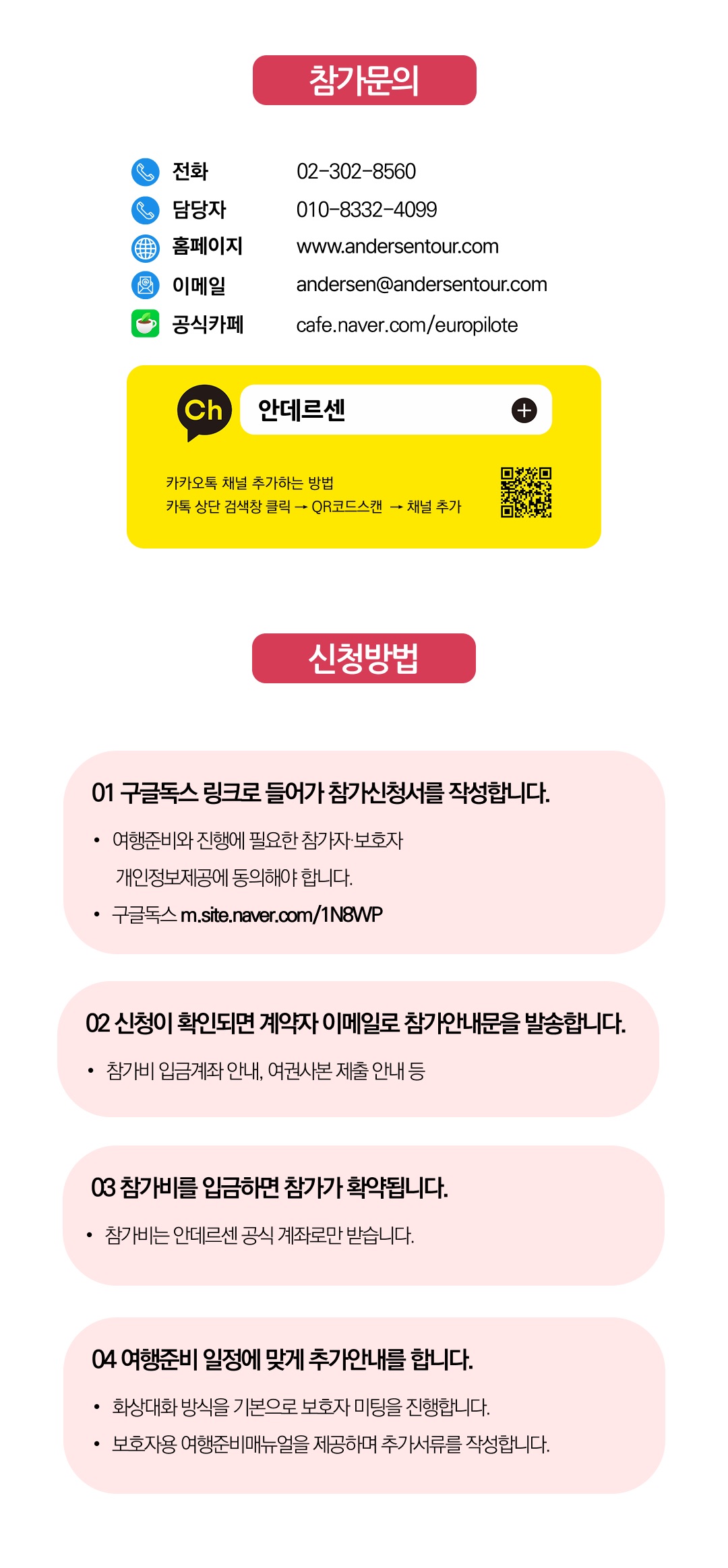상세한 여행준비를 위해 구글 참가신청서를 작성해주셔야 합니다. 구글독스 참가신청서를 작성하지 않으면 정상적으로 예약이 접수되지 않습니다. 클릭하면 바로 구글 참가신청서로 연결됩니다.