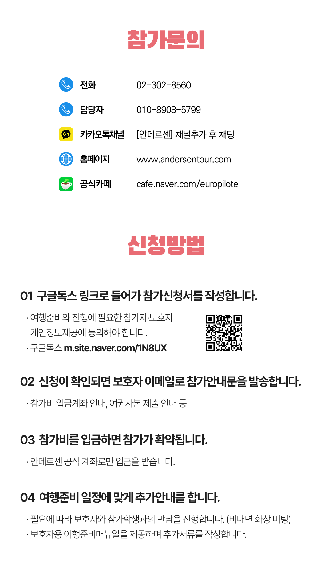 상세한 여행준비를 위해 구글 참가신청서를 작성해주셔야 합니다. 구글독스 참가신청서를 작성하지 않으면 정상적으로 예약이 접수되지 않습니다. 클릭하면 바로 구글 참가신청서로 연결됩니다.