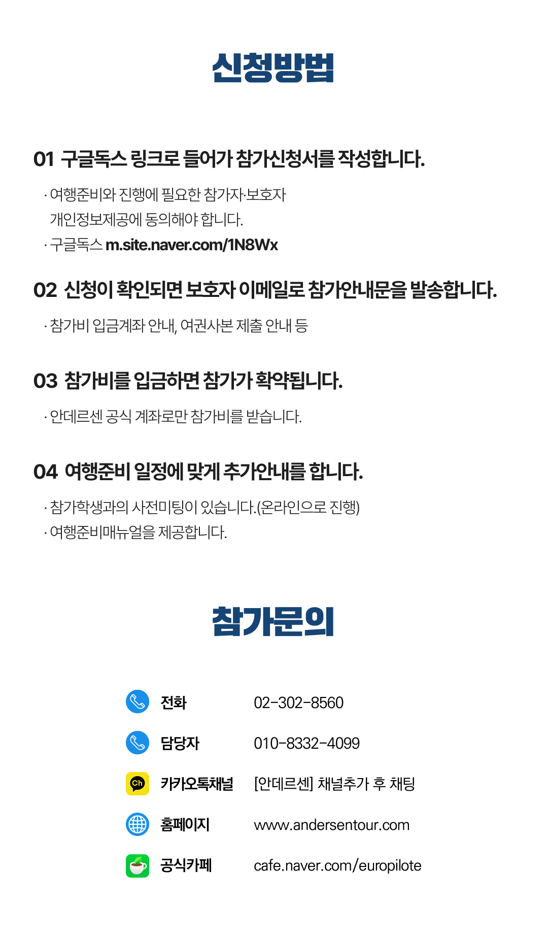 상세한 여행준비를 위해 구글 참가신청서를 작성해주셔야 합니다. 구글독스 참가신청서를 작성하지 않으면 정상적으로 예약이 접수되지 않습니다. 클릭하면 바로 구글 참가신청서로 연결됩니다.