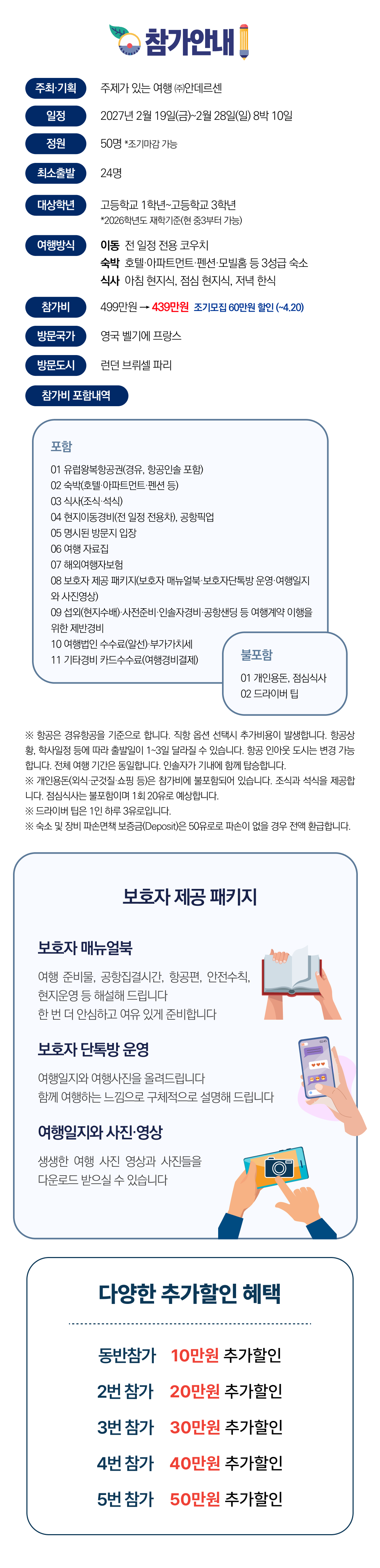 안전한 여행을 위해 주최측은 외교부 해외안전여행, 현지언론보도 등을 예의주시하며 예기치 않은 상황발생시에도 빠르게 조치를 취하고 있습니다. 이와 별도로 여행참가 전 해당 방문국의 여행안전경보, 예방접종 등과 관련해서는 보호자와 여행자 각자가 판단해야 합니다. 외교부 해외안전여행, 해외여행 질병정보 등의 사이트를 확인바랍니다. 어플을 설치하셔서 실시간 확인하는 것이 좋습니다. 비의료인은 의료조치를 할 수 없습니다. 주최측은 예방접종 등 의료적 권고는 하지 않습니다. 여행자가 스스로 판단해 진행 바랍니다.
