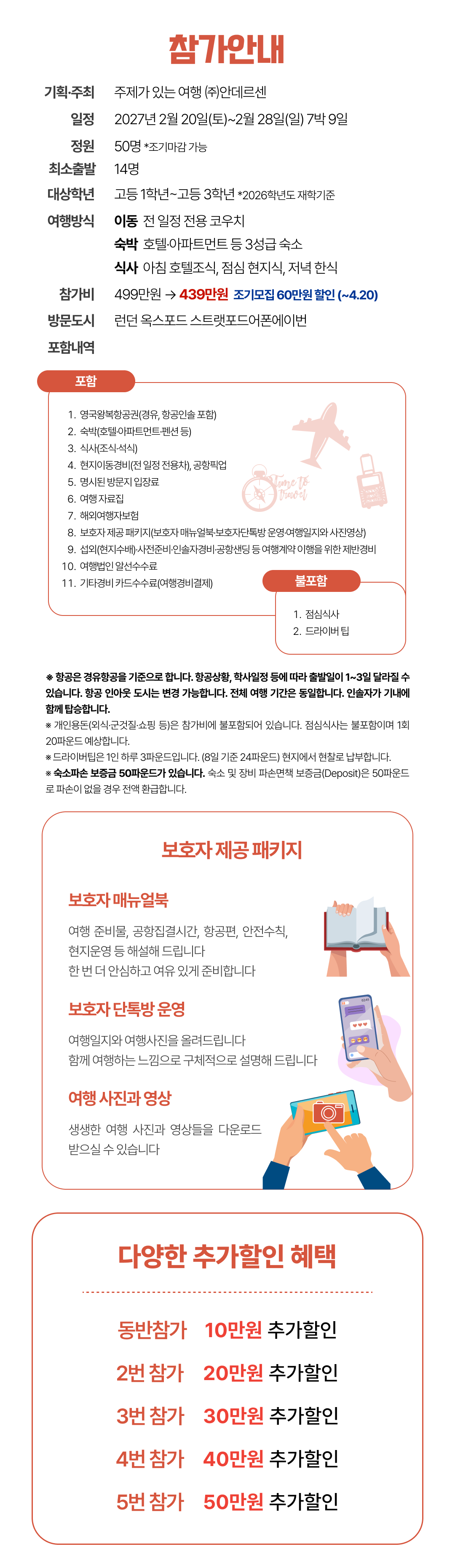 안전한 여행을 위해 주최측은 외교부 해외안전여행, 현지언론보도 등을 예의주시하며 예기치 않은 상황발생시에도 빠르게 조치를 취하고 있습니다. 이와 별도로 여행참가 전 해당 방문국의 여행안전경보, 예방접종 등과 관련해서는 보호자와 여행자 각자가 판단해야 합니다. 외교부 해외안전여행, 해외여행 질병정보 등의 사이트를 확인바랍니다. 어플을 설치하셔서 실시간 확인하는 것이 좋습니다. 비의료인은 의료조치를 할 수 없습니다. 주최측은 예방접종 등 의료적 권고는 하지 않습니다. 여행자가 스스로 판단해 진행 바랍니다.