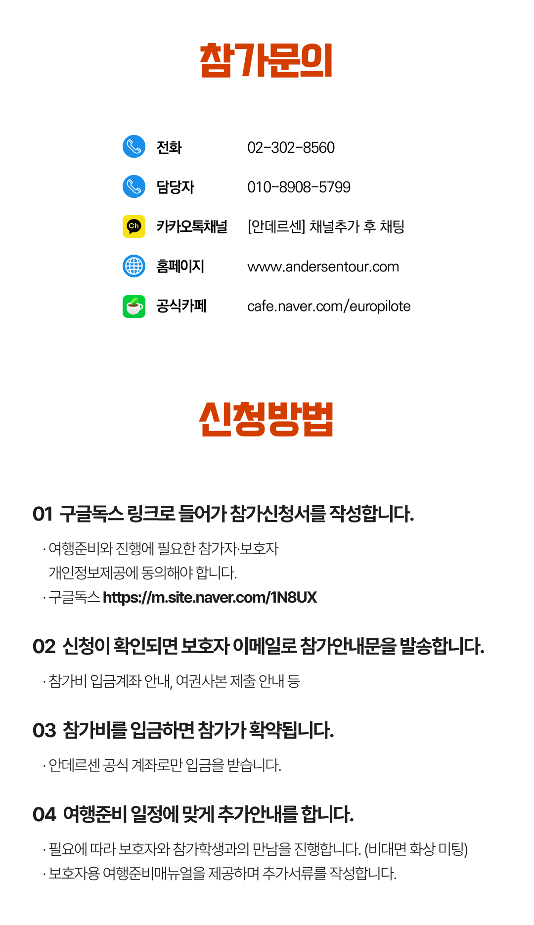 상세한 여행준비를 위해 구글 참가신청서를 작성해주셔야 합니다. 구글독스 참가신청서를 작성하지 않으면 정상적으로 예약이 접수되지 않습니다. 클릭하면 바로 구글 참가신청서로 연결됩니다.