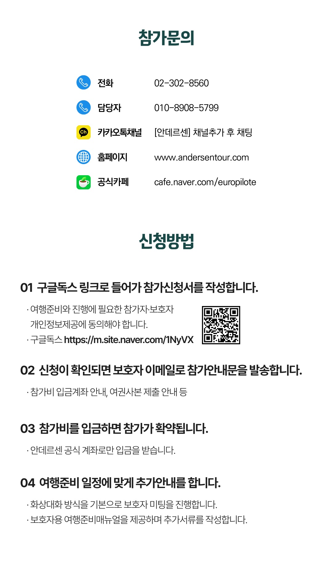 상세한 여행준비를 위해 구글 참가신청서를 작성해주셔야 합니다. 구글독스 참가신청서를 작성하지 않으면 정상적으로 예약이 접수되지 않습니다. 클릭하면 바로 구글 참가신청서로 연결됩니다.