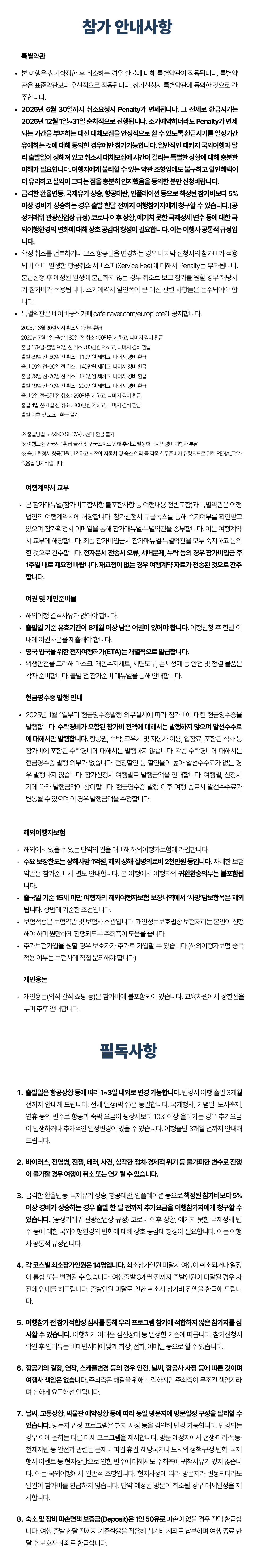안전한 여행을 위해 주최측은 외교부 해외안전여행, 현지언론보도 등을 예의주시하며 예기치 않은 상황발생시에도 빠르게 조치를 취하고 있습니다. 이와 별도로 여행참가 전 해당 방문국의 여행안전경보, 예방접종 등과 관련해서는 보호자와 여행자 각자가 판단해야 합니다. 외교부 해외안전여행, 해외여행 질병정보 등의 사이트를 확인바랍니다. 어플을 설치하셔서 실시간 확인하는 것이 좋습니다. 비의료인은 의료조치를 할 수 없습니다. 주최측은 예방접종 등 의료적 권고는 하지 않습니다. 여행자가 스스로 판단해 진행 바랍니다.